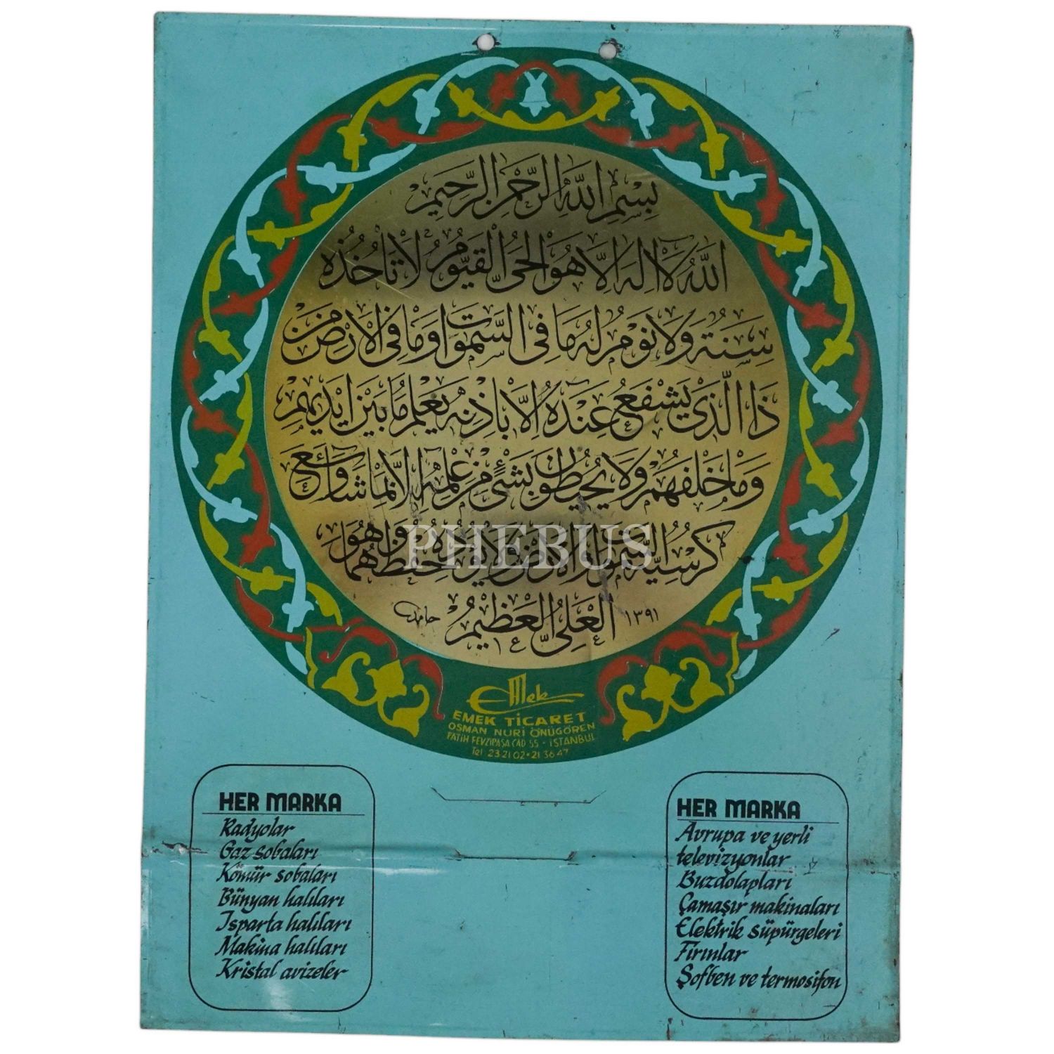 Hamid Aytaç´ın sülüs Ayete´l-Kürsî levhası basılı metal takvimlik, muhtemelen 70´li yıllar, 50x37 cm...