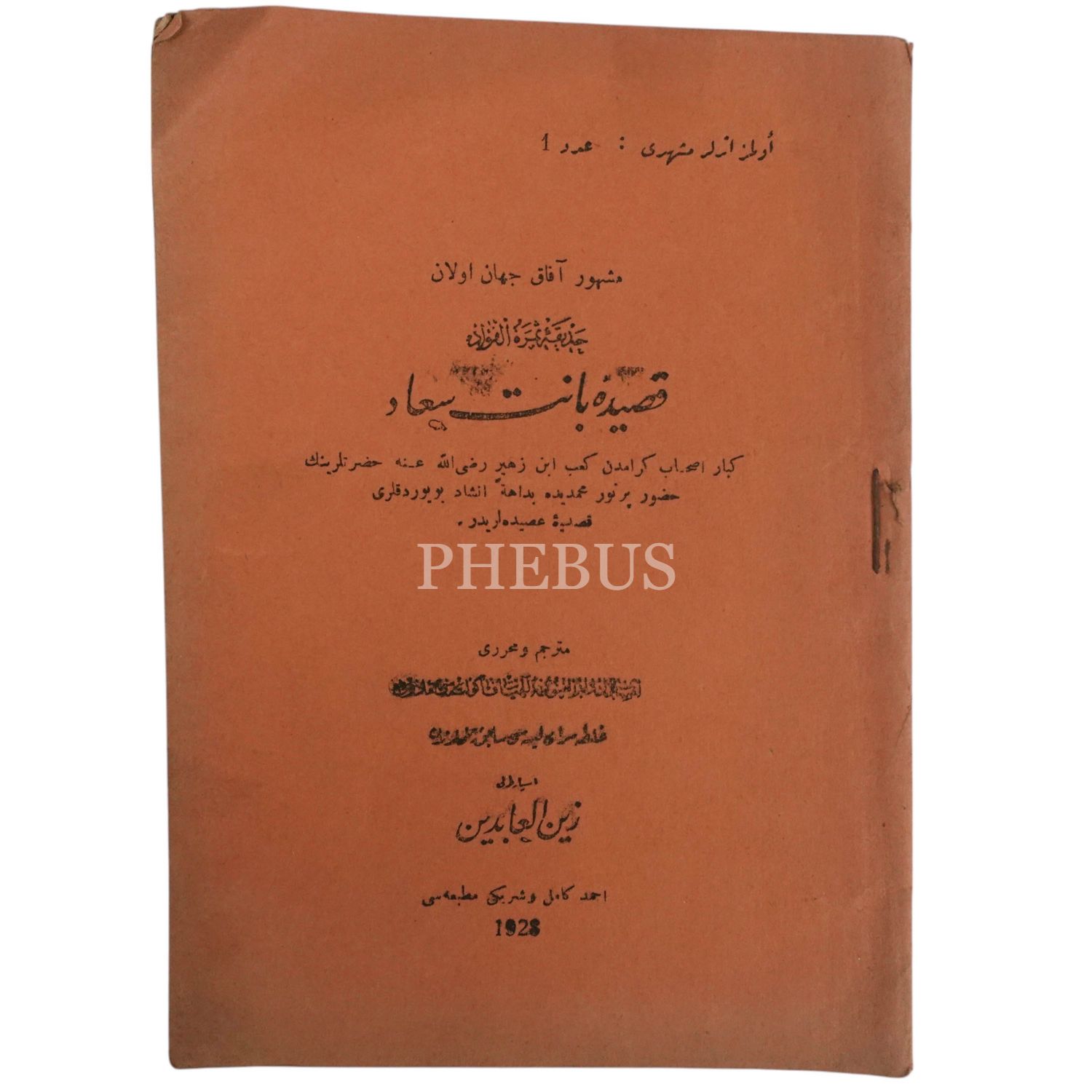 KASİDE-İ BANET SUAD TERCÜMESİ, Ka´ab b. Zübeyr, (çeviren: Ispartalı Zeynel Abidin), 1928, Ahmed Kamil ve Şürekası Matbaası, 50 sayfa, 14x20 cm...