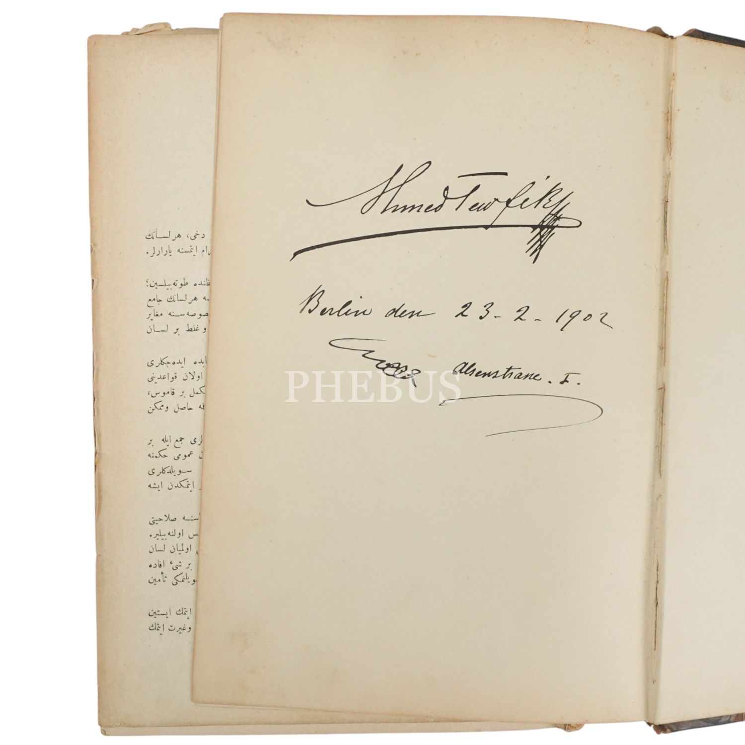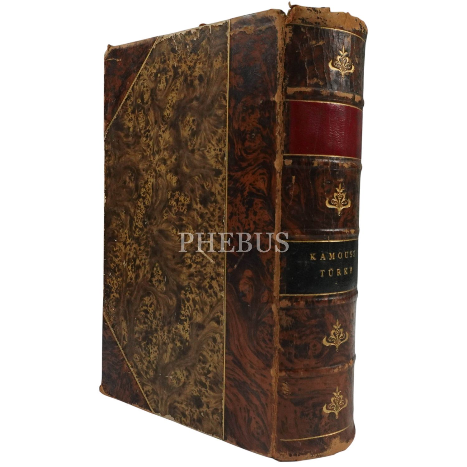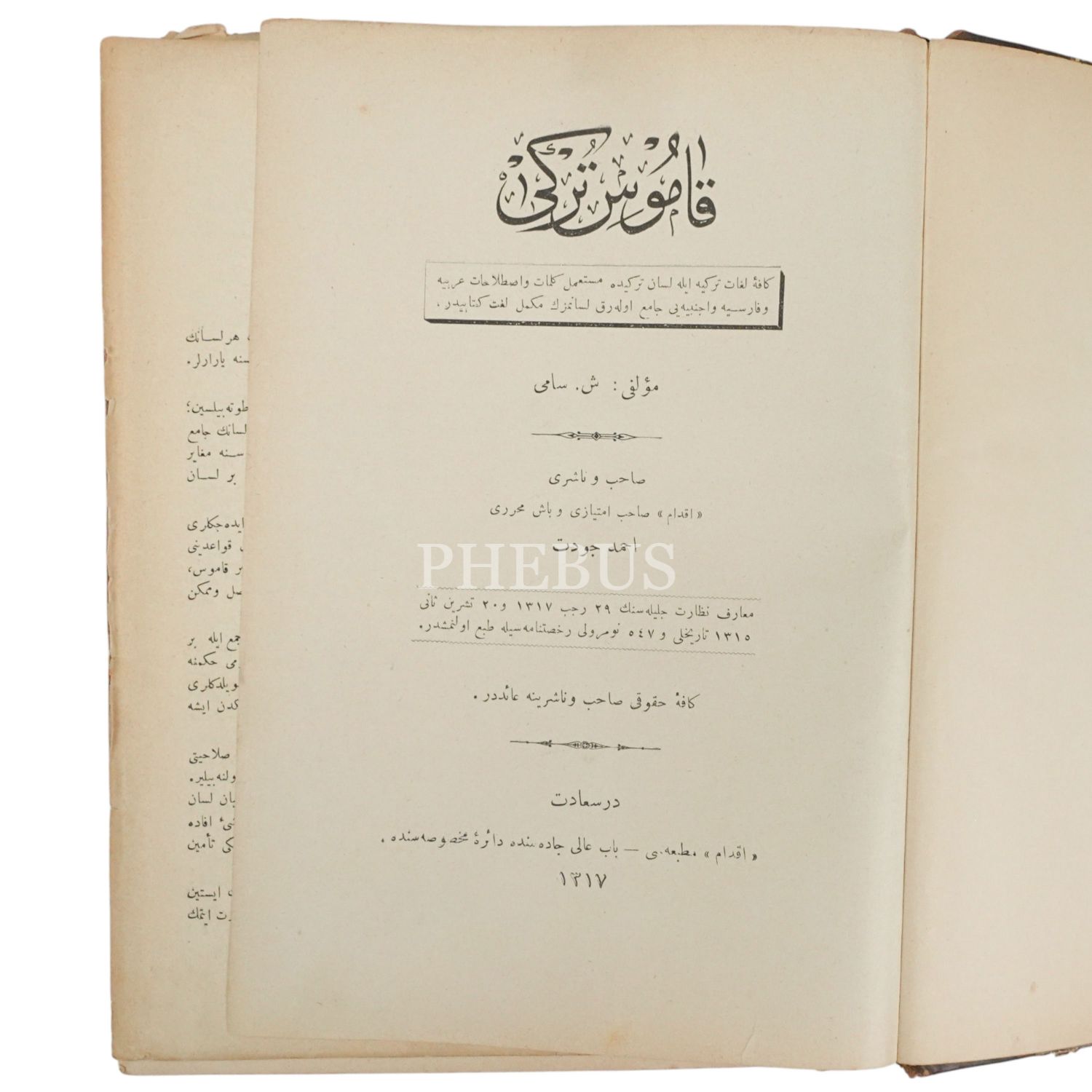 Türk edebiyatında birçok ilke imza atmış; ilk Türkçe romanın, adında Türk sözcüğü geçen ilk Türkçe´den Türkçe sözlüğün ve ilk Türkçe ansiklopedinin yazarı Şemseddin Sami tarafından kaleme alınan, Türkçe´den Türkçe´ye kaleme alınmış sözlükler arasında, Osmanlı Türkçesi´nde kullanımda olmayan Arapça-Farsça kelimeleri ayıklayarak, Türkçe kökenli sözcüklere ağırlık vermesi nedeniyle önemli bir yer tutan sözlüktür. Satışa sunduğumuz nüsha, deri sırtlı, ebru kapaklı bir Avrupa cildindedir. Kitabın ilk sayfasında "Berlin´den 23-2-1902" notu ile Osmanlıca ve Latin harfleriyle kaleme alınmış "Ahmet Tevfik" imzası yer almaktadır.