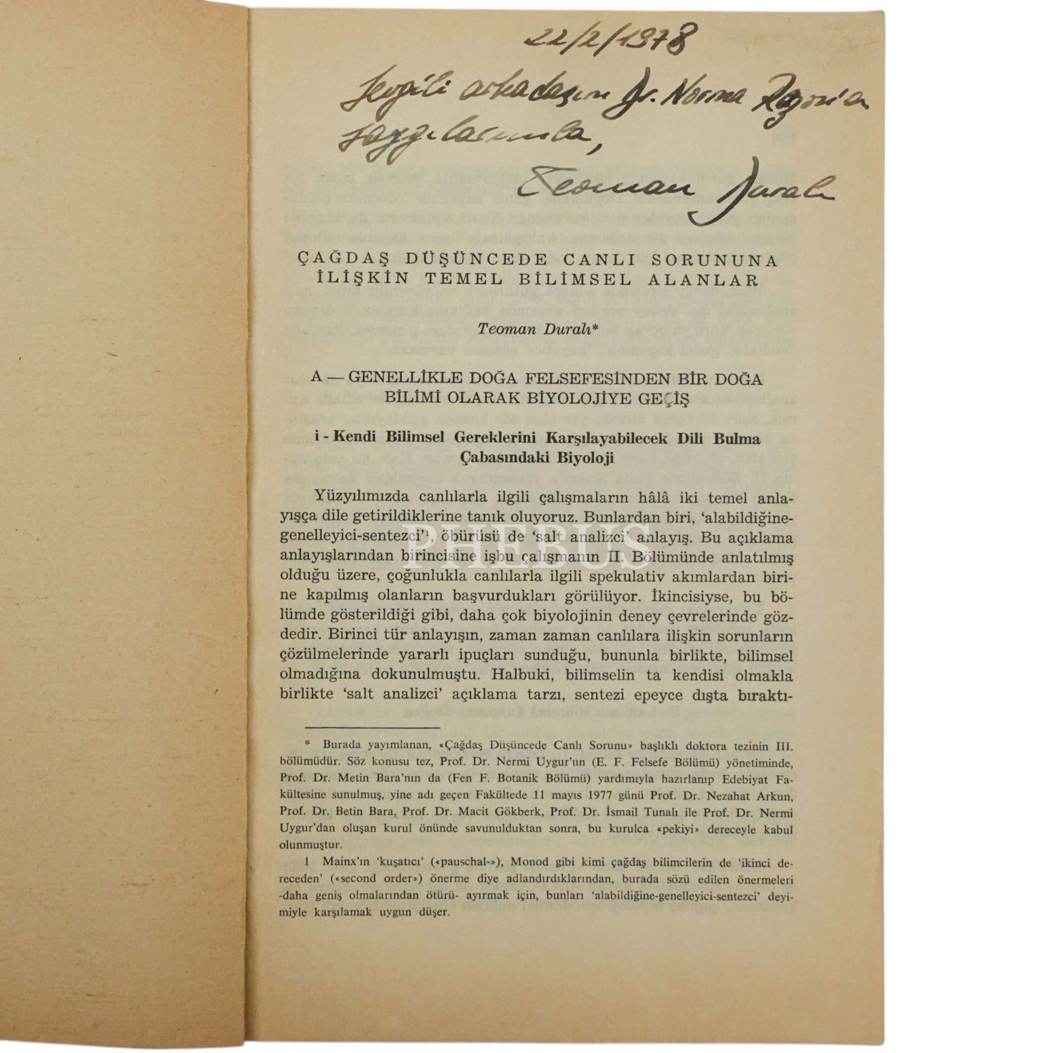 ÇAĞDAŞ DÜŞÜNCEDE CANLI SORUNUNA İLİŞKİN TEMEL BİLİMSEL ALANLAR, Teoman Duralı, 1978, İstanbul Üniversitesi Edebiyat Fakültesi Basımevi, 17x24 cm...
