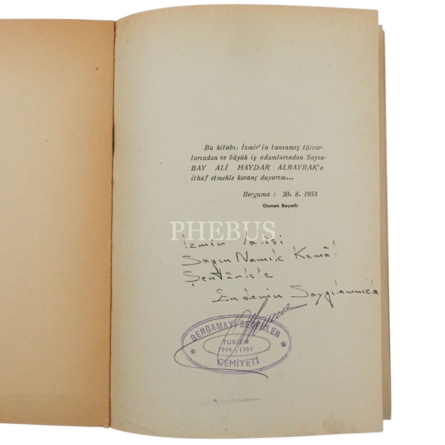 "İzmir Valisi Sayın Namık Kemal Şentürk´e en derin saygılarımla" ithafıyla imzalanmıştır.