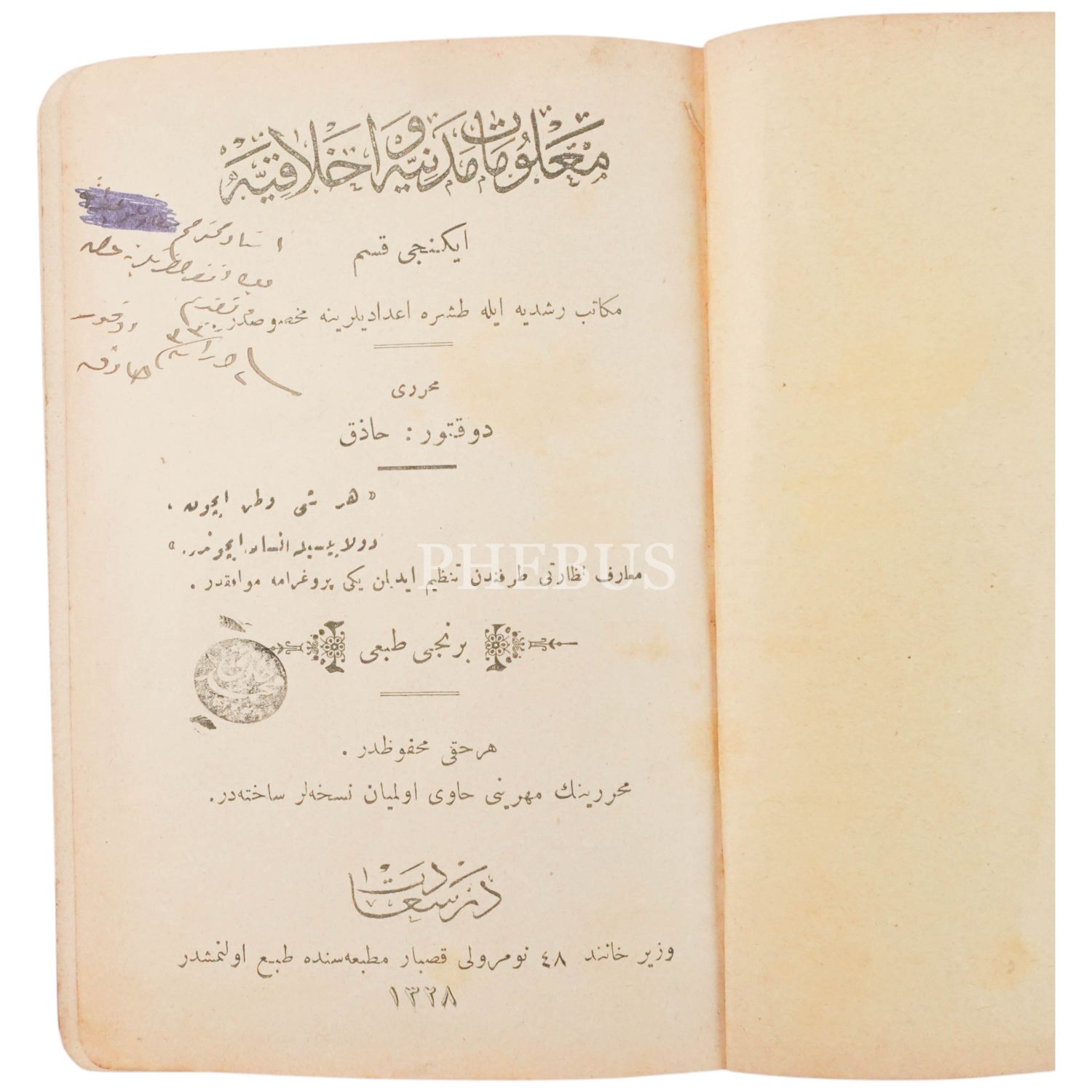 MALUMAT-I MEDENİYE VE AHLAKİYE (2. kısım), Mehmed Hazik, 1328, 184 sayfa, 12x18 cm..