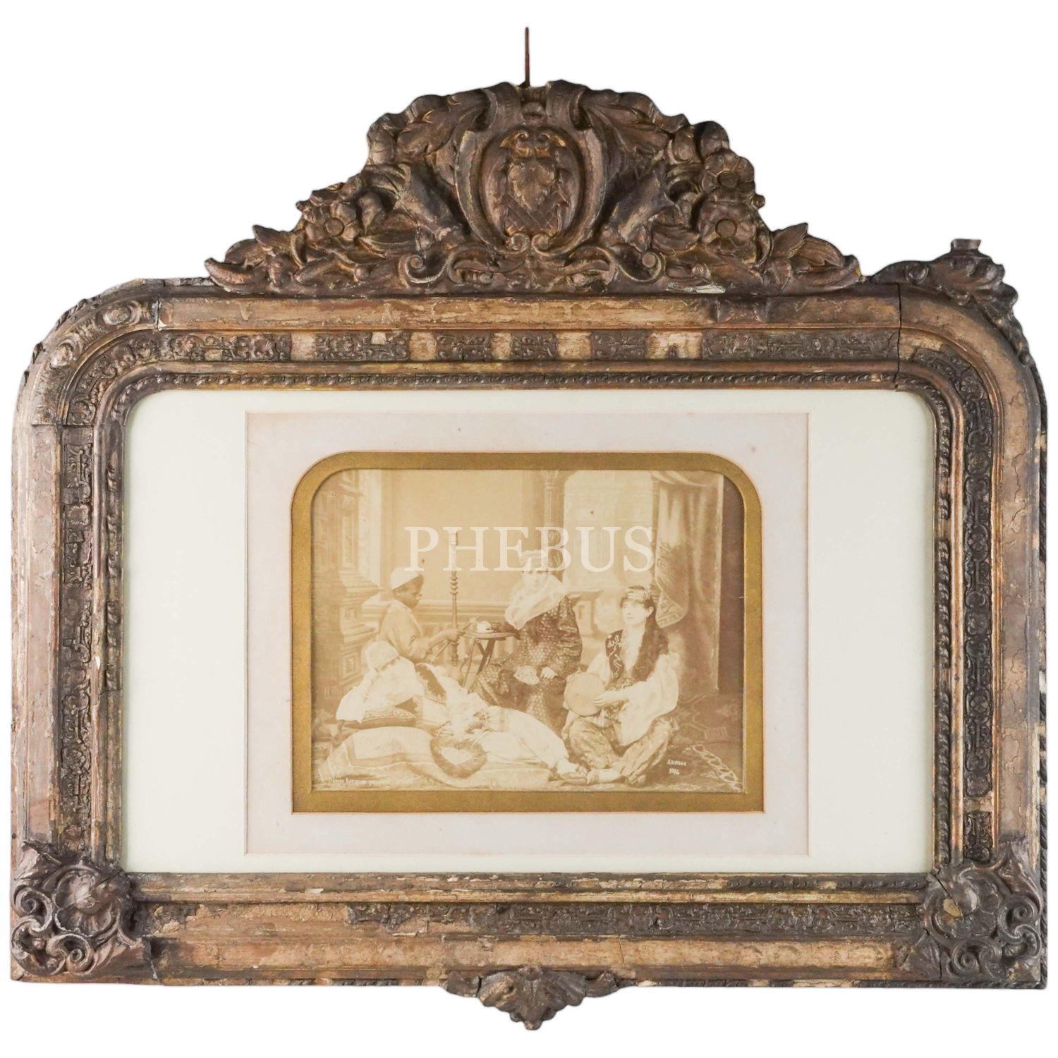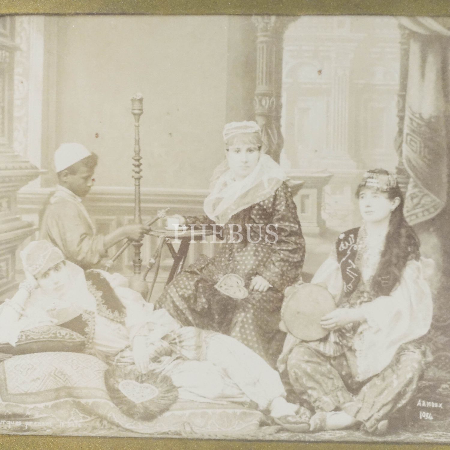 Mısır´da yerleşik Fransız fotoğrafçı Arnoux Hippolyte tarafından çekilen, kahve içen Türk kadınları temalı stüdyo fotoğrafı, albümin baskı, floral desenlerle bezeli göz alıcı dönem çerçevesinde, "Dames turques prenant le Cafe", fotoğraf 28x20 cm, çerçeve 67x64 cm...