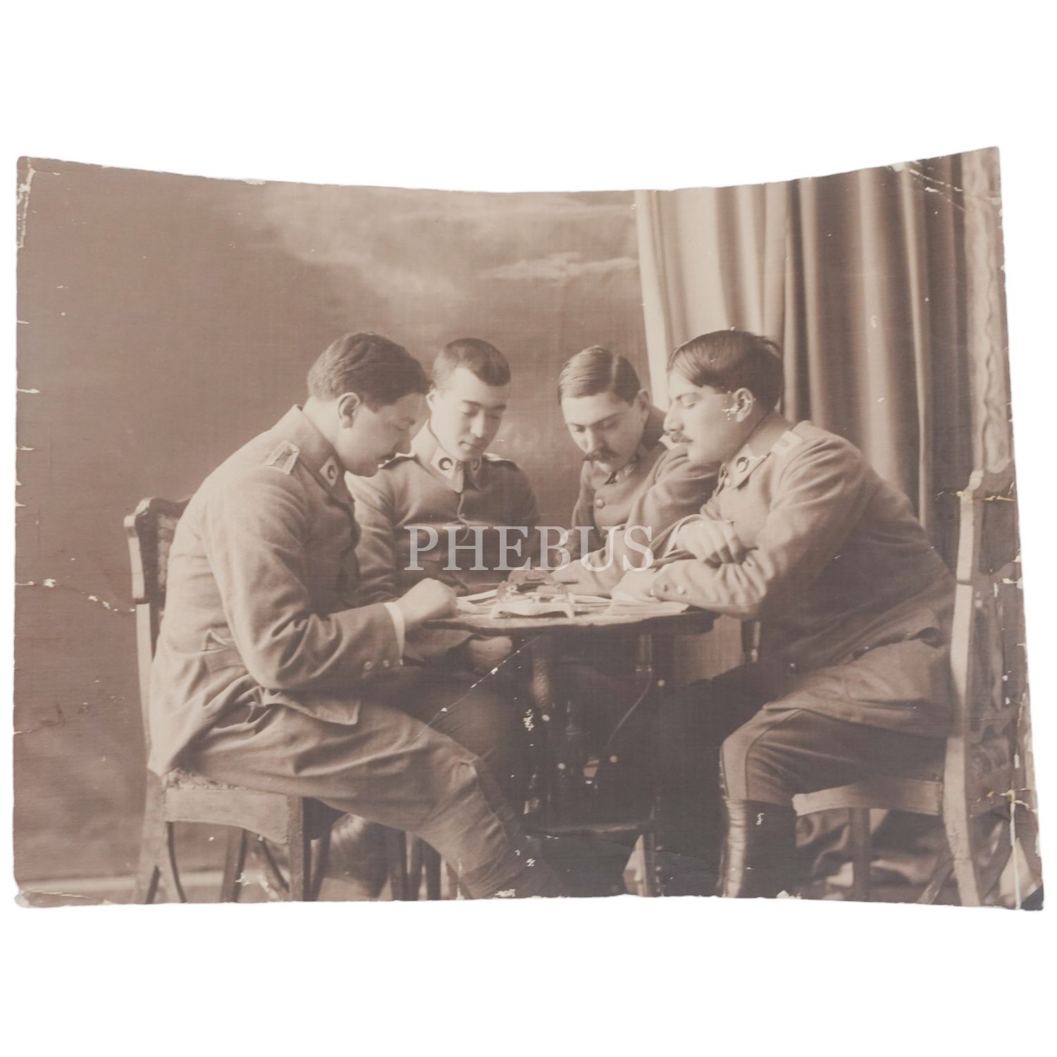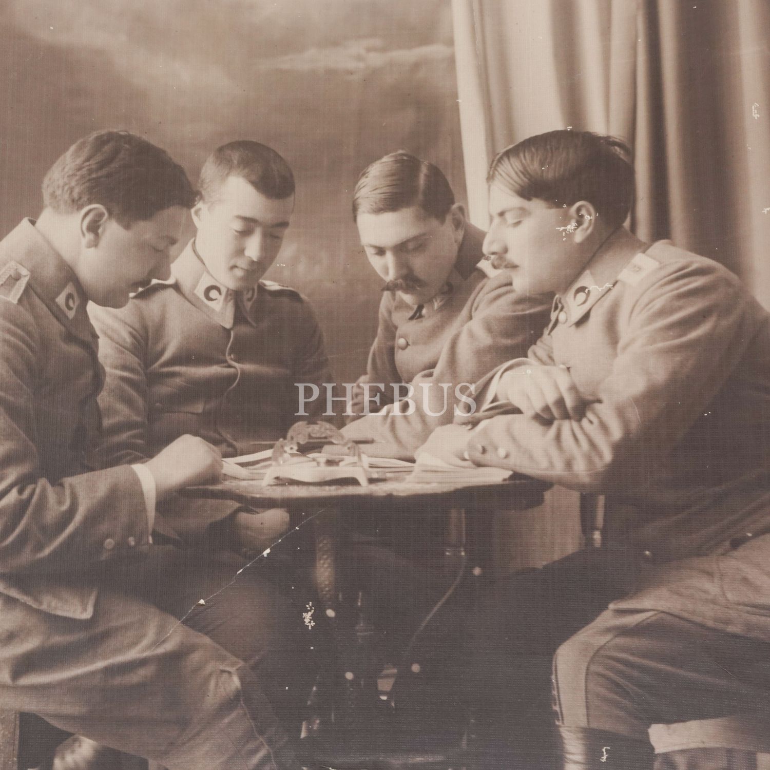 Kızılay görselli yaka apoletli üniformalarıyla kamera karşısına geçen bir grup sıhhiyeci subayın stüdyo hatıra fotoğrafı, 24x18 cm...