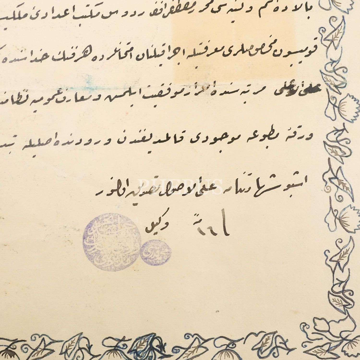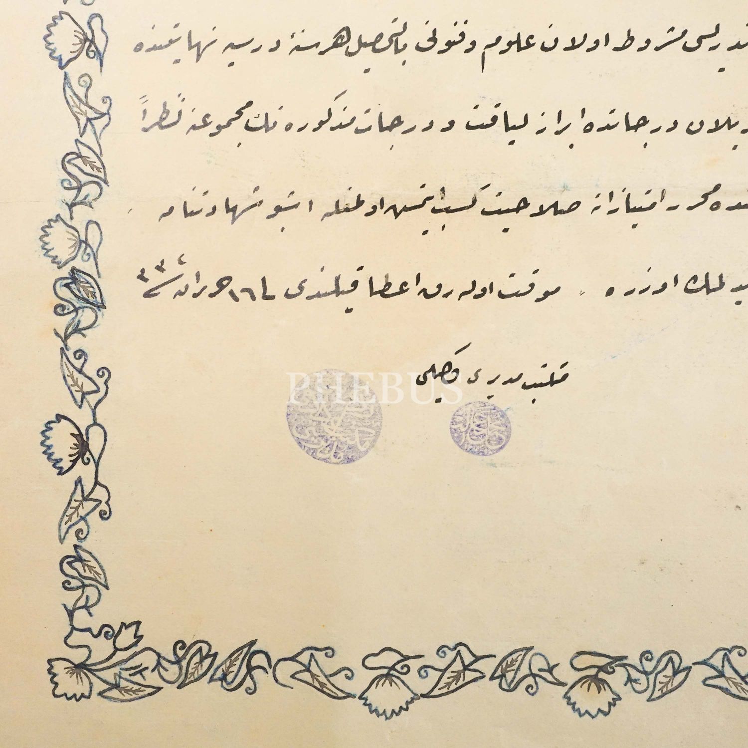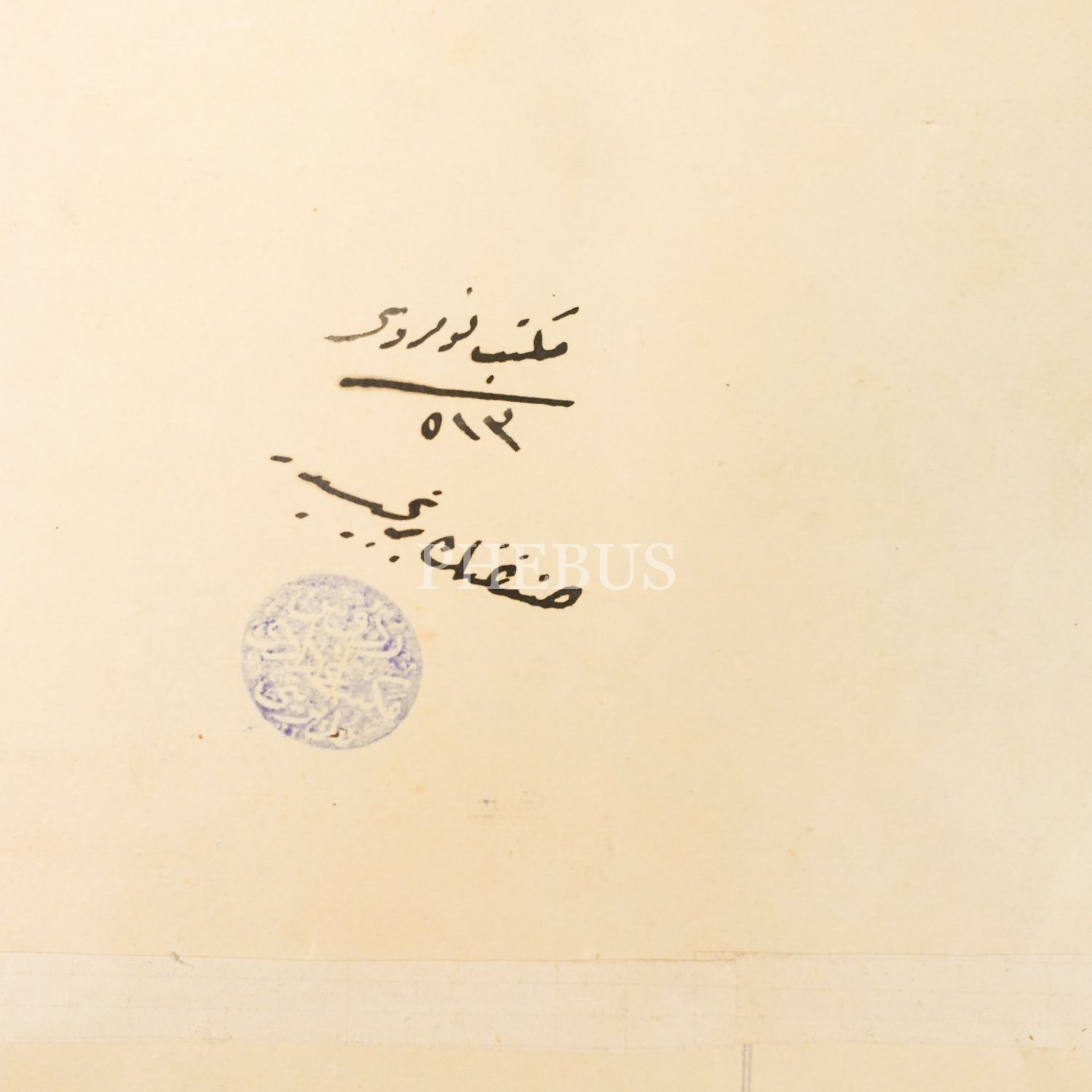 Satışa sunduğumuz diplomanın alt satırlarında yer alan "İşbu şehadetname varaka-i matbua mevcudu kalmadığından vürudunda aslıyla tebdil edilmek üzere muvakkat olarak ita´ kılındı" notundan da anlaşılacağı üzere matbu bir evrak kalmadığı için sonrasında aslıyla değiştirilmek şartıyla el ile hazırlanarak teslim edilmiştir.