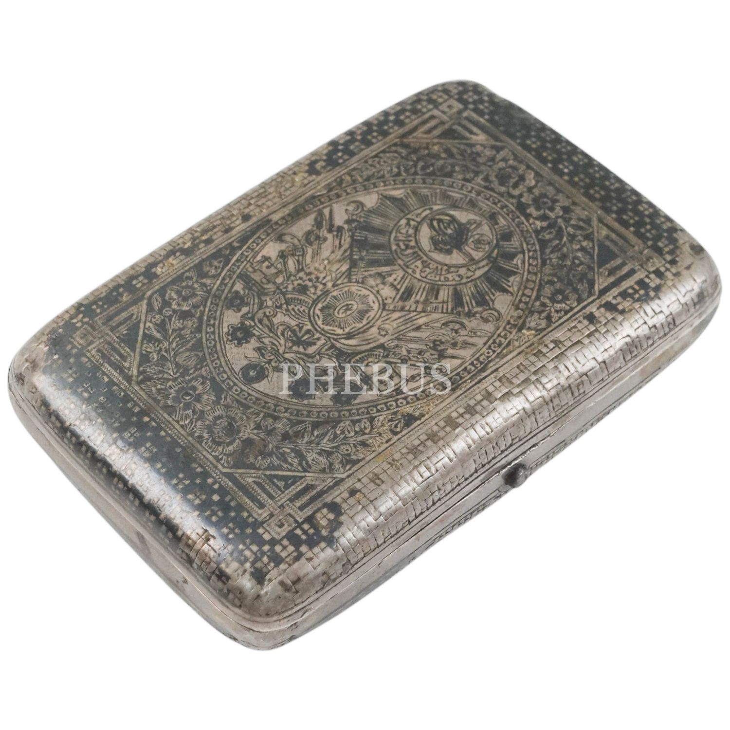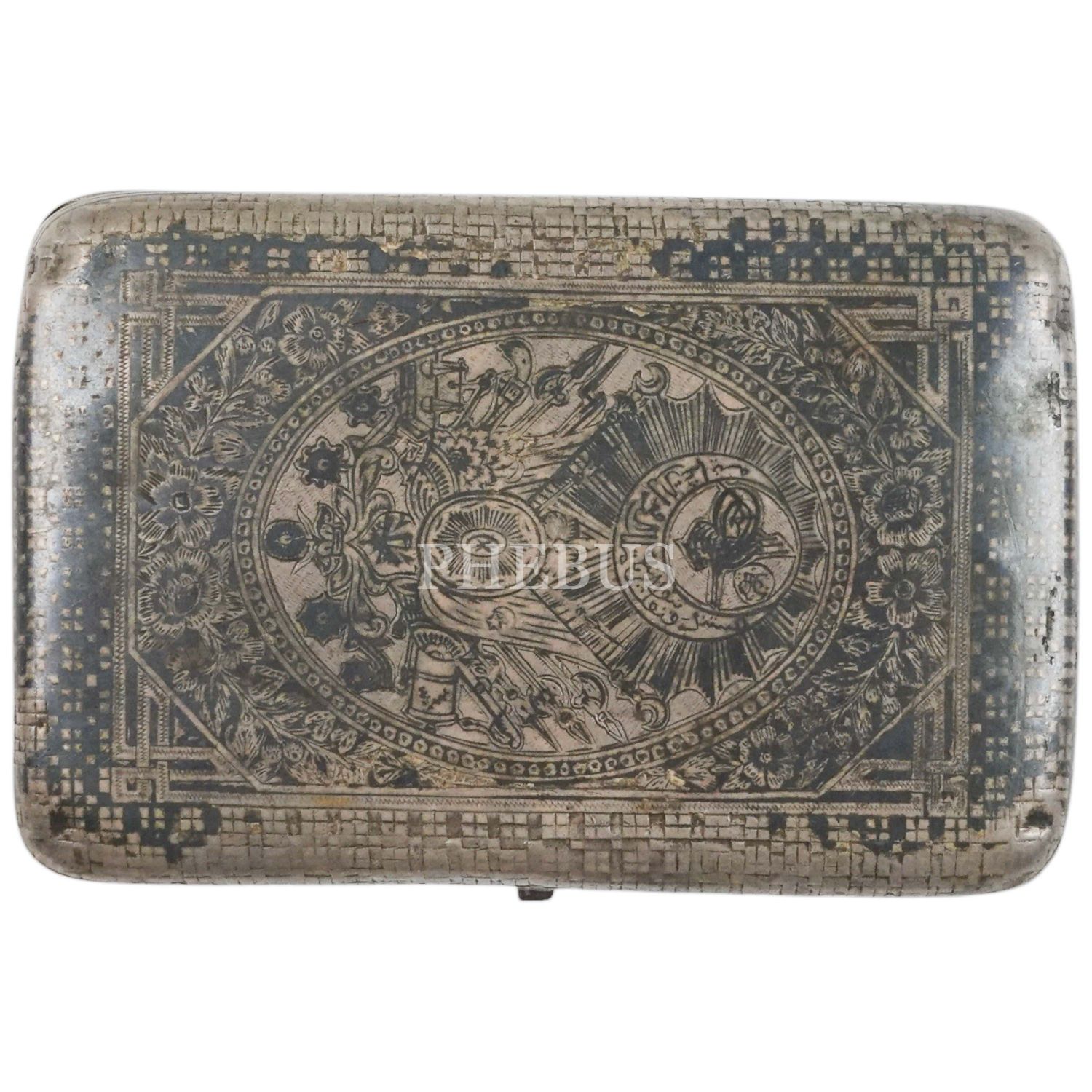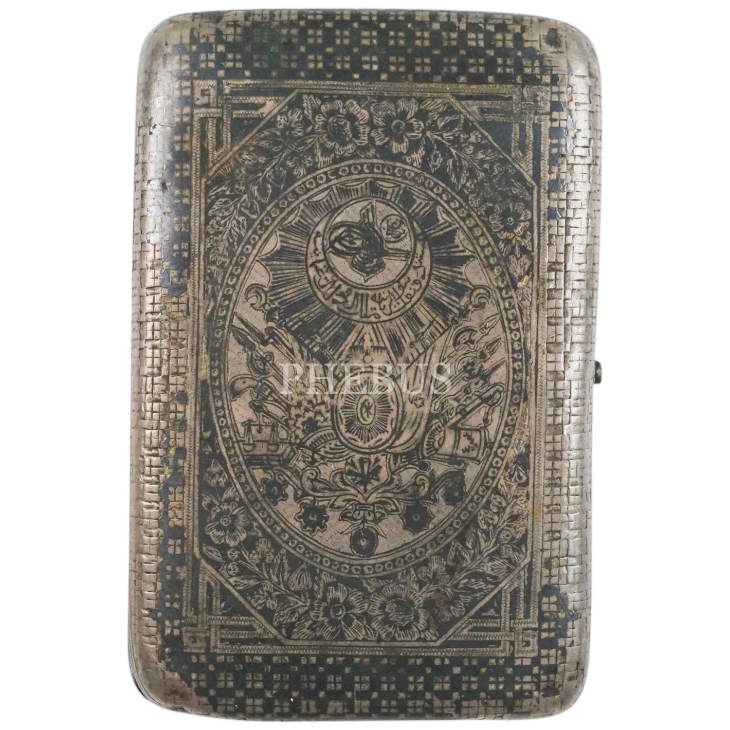 Kalem ve savat işçiliğiyle Osmanlı Devlet Arması ve floral desenlerle bezenmiş, Osmanlıca ve Ermenice "Van" damgalı gümüş tabaka, 113 gr, 9x6 cm...