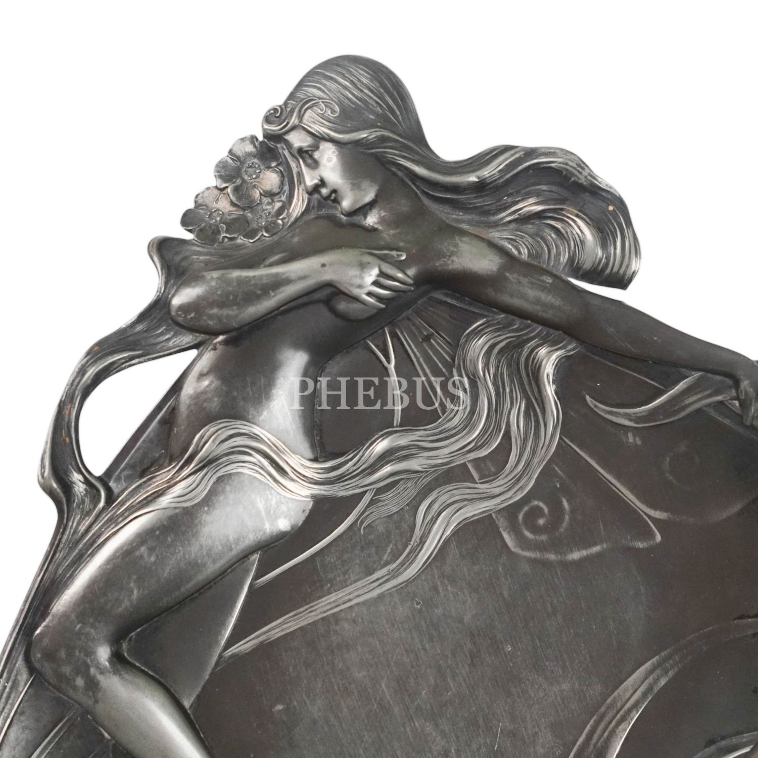 Nü kadın figürlü ve kalp formunda tasarlanmış gümüş sunumluk, 586 gr, 23x26 cm...