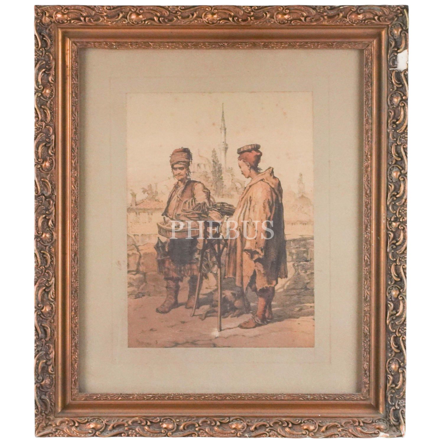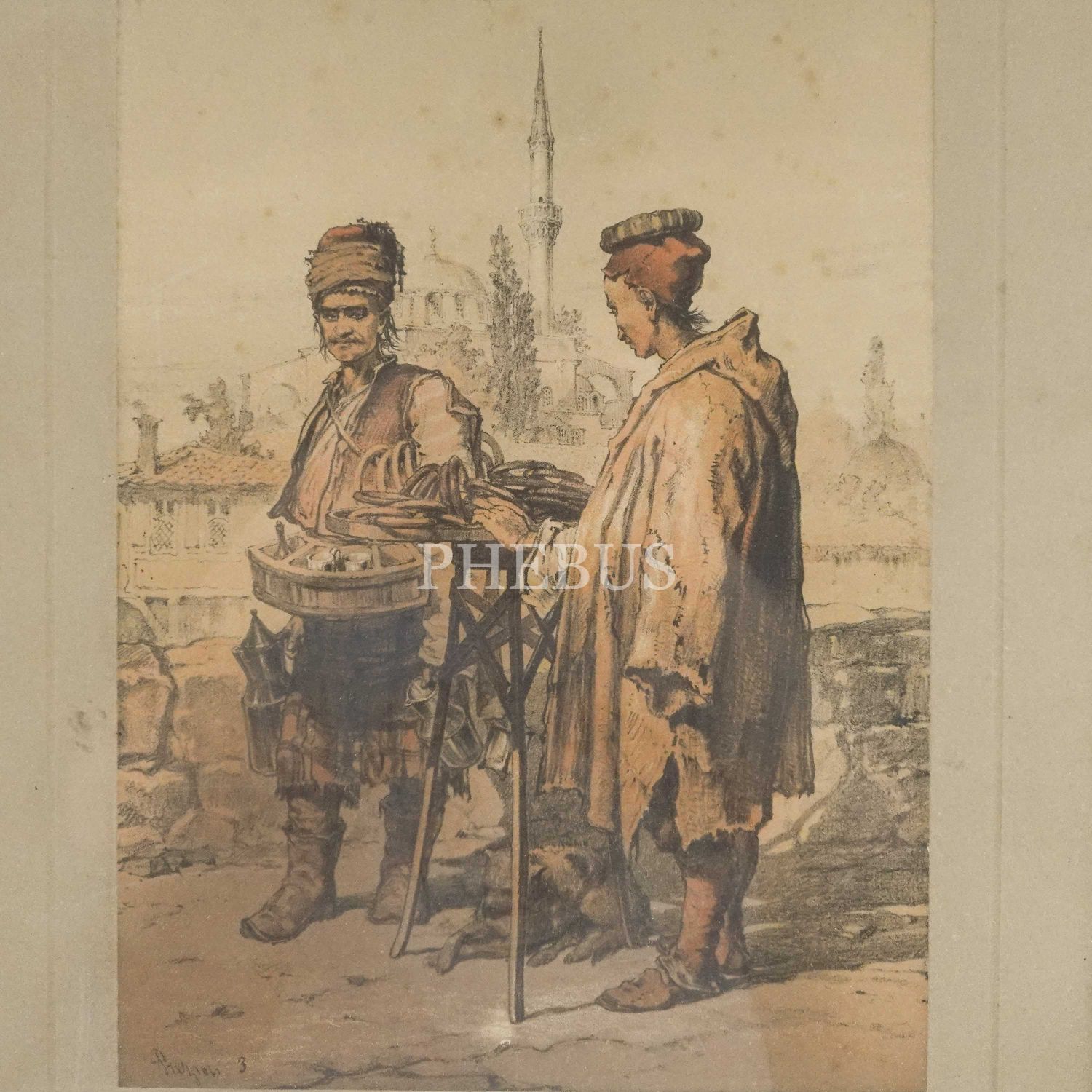 Amedeo Preziosi tarafından 1858 yılında yayımlanan “STAMBOUL: Recollections of Eastern Life” adlı albümünde yer alan "Simitçi" resminin, sanatçının ıslak imzasını taşıyan renkli taşbaskısı, eser 26x35 cm, çerçeve 51x60 cm...