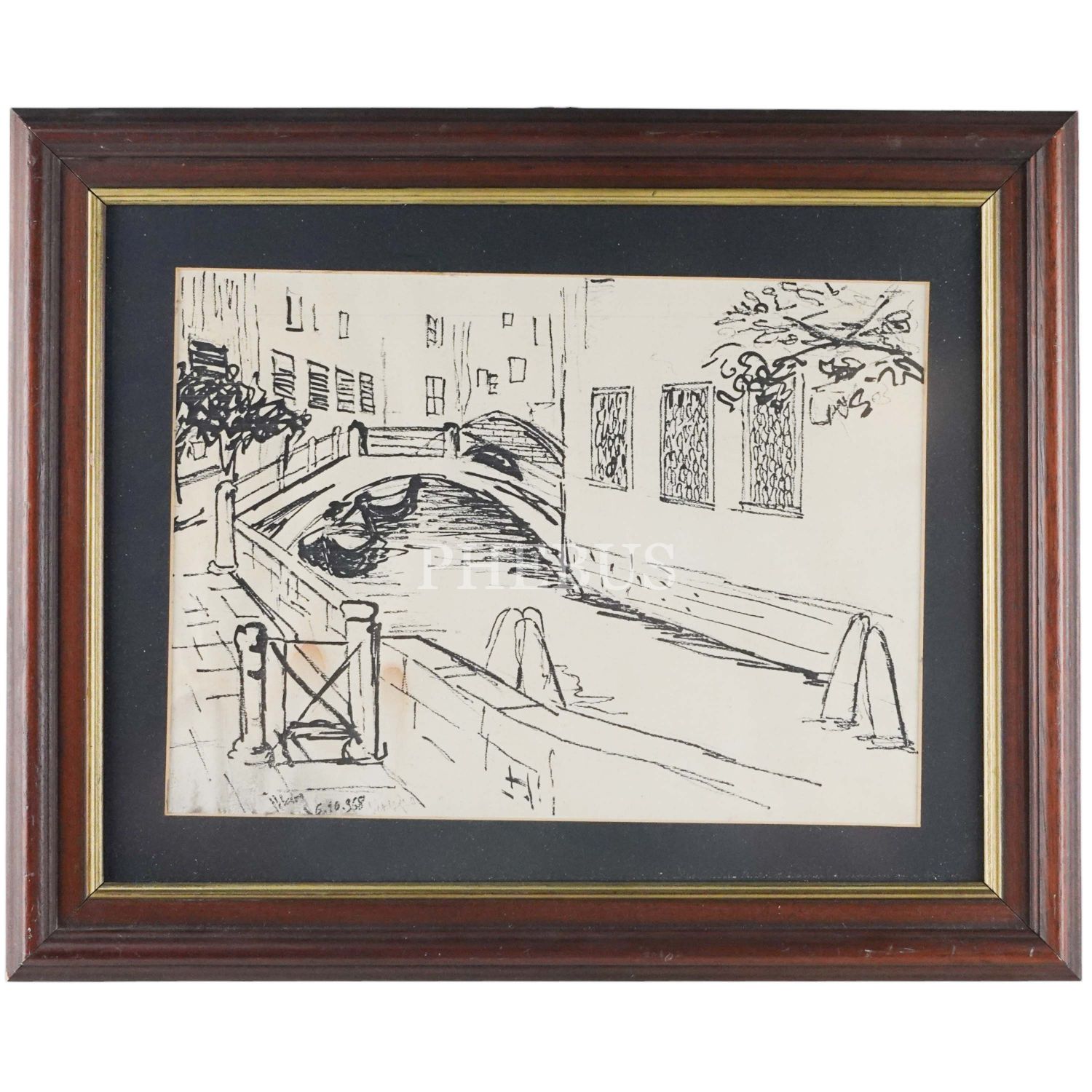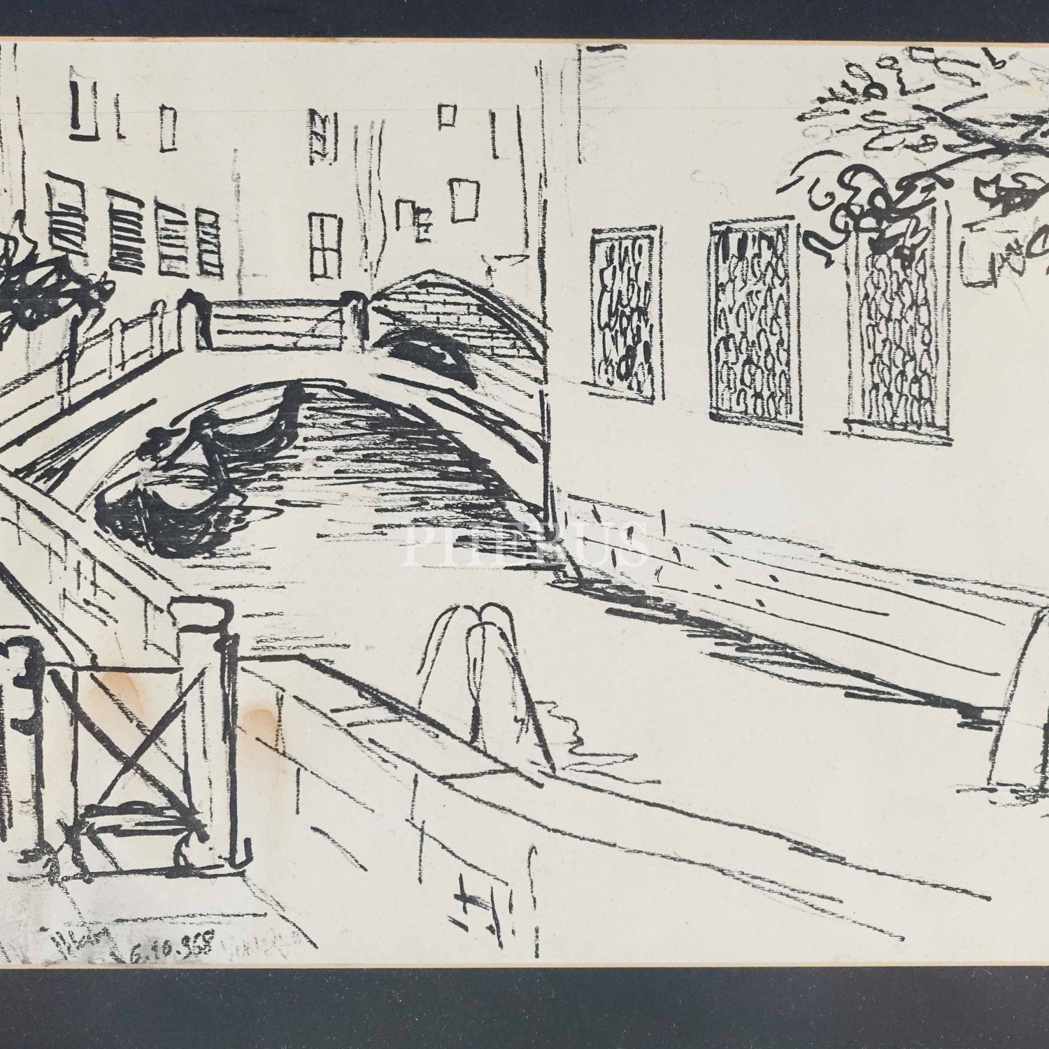 İlhan Berk´in ıslak imzasını taşıyan, kağıt üzeri çini mürekkebiyle çizilmiş "Venezia" (Venedik) isimli orijinal resim, 1968, 25x35 cm....
