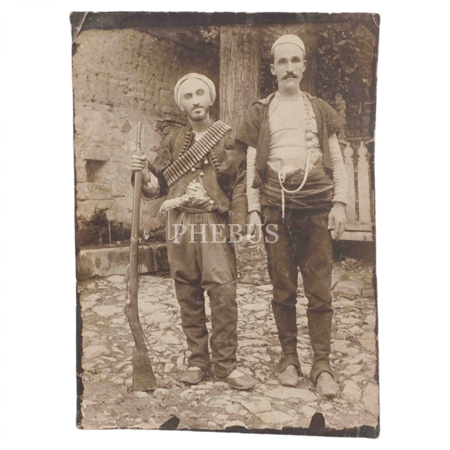 Boynunda yaver kordonu taşıyan silah arkadaşıyla el ele tutuşarak kamera karşısına geçen efeler, 9x12 cm...