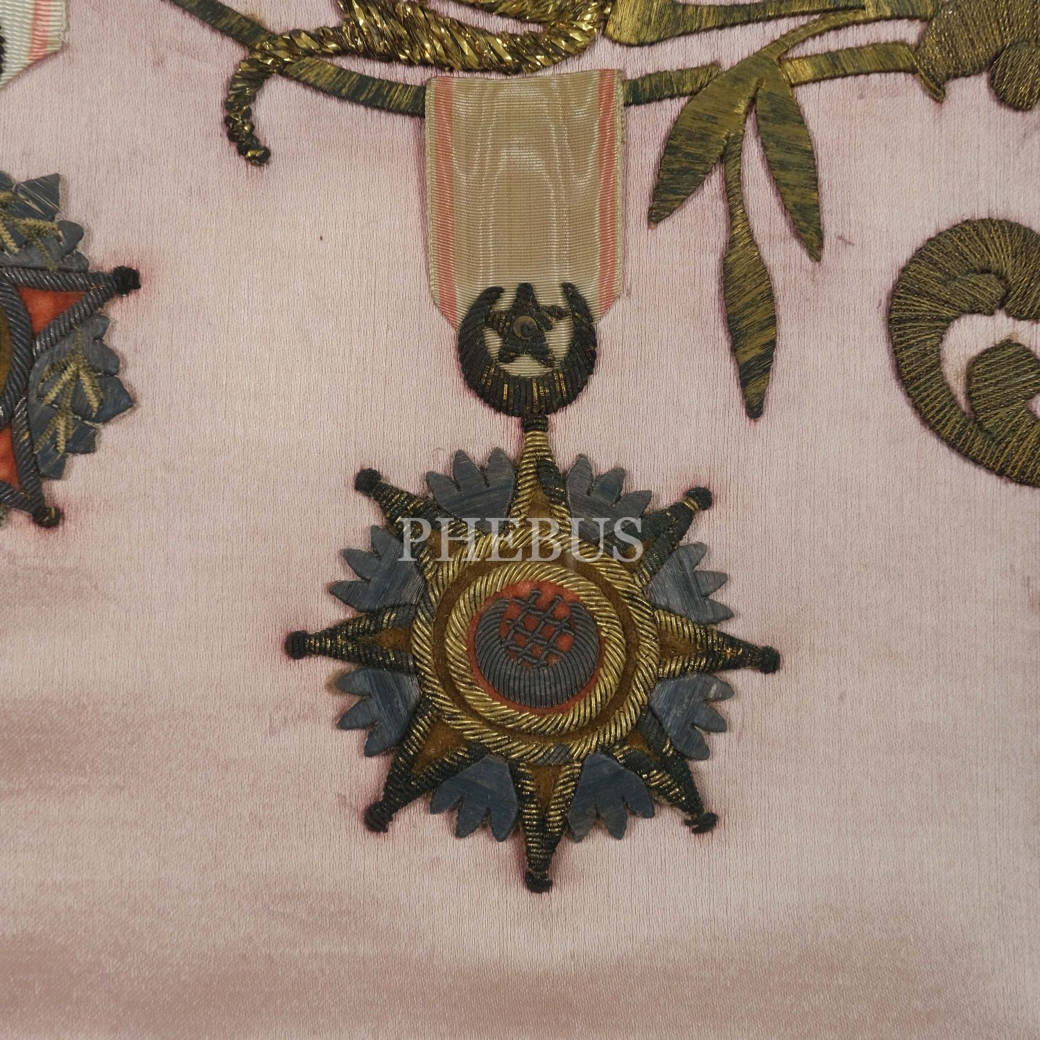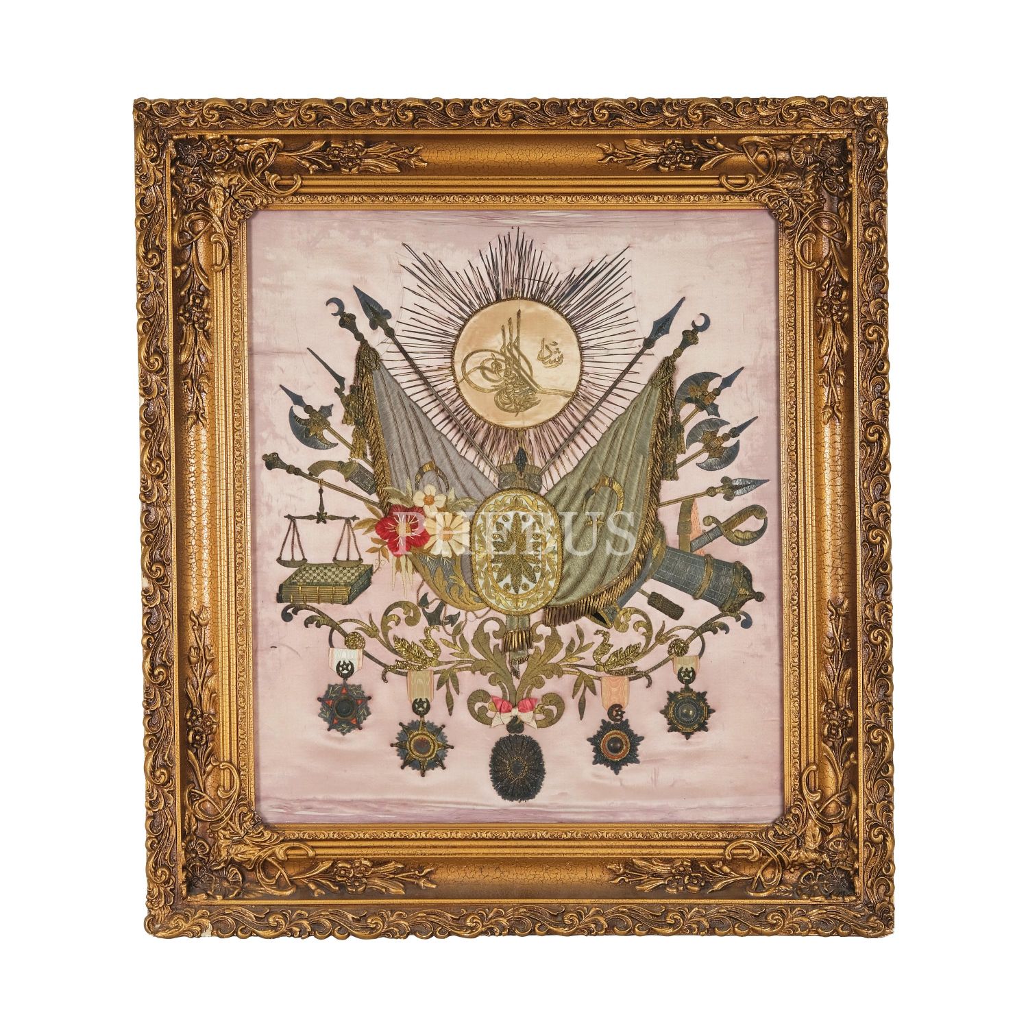 Sarayın sırmakeşi Leon Carayan tarafından, sırma işçilik ile bez üzerine nakşedilen Sultan Beşinci Mehmed Reşad´ın tuğrası ve Osmanlı Devlet arması, bez 57x64 cm, çerçeve 79x88 cm...