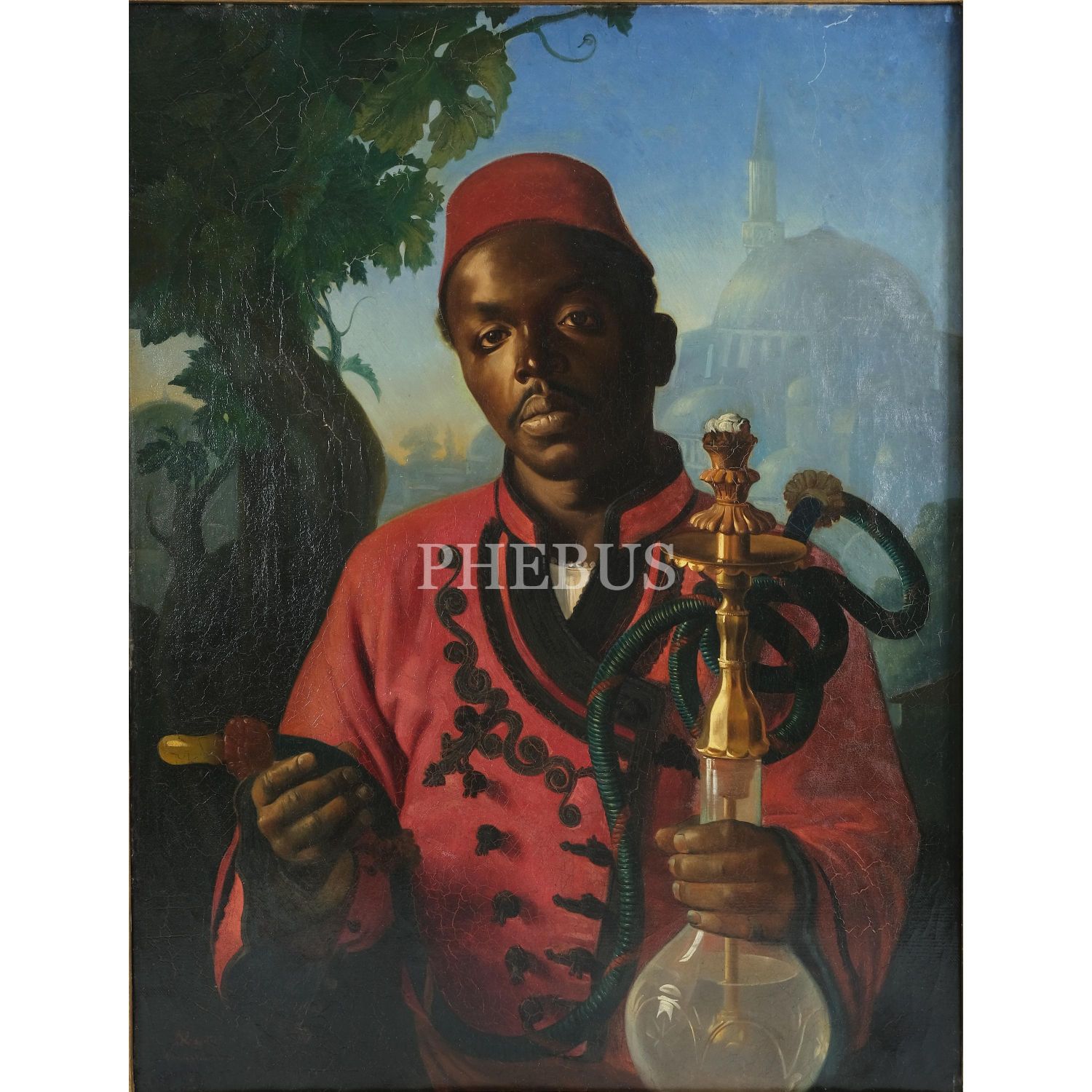 François Claude Hayette'den imzalı, Kılıç Ali Paşa Cami silüeti önünde elinde nargile tutan kızlarağasının resmedildiği yağlı boya tablo, "Hayette, Constantinople", tablo 63x81, çerçeve 88x110 cm...