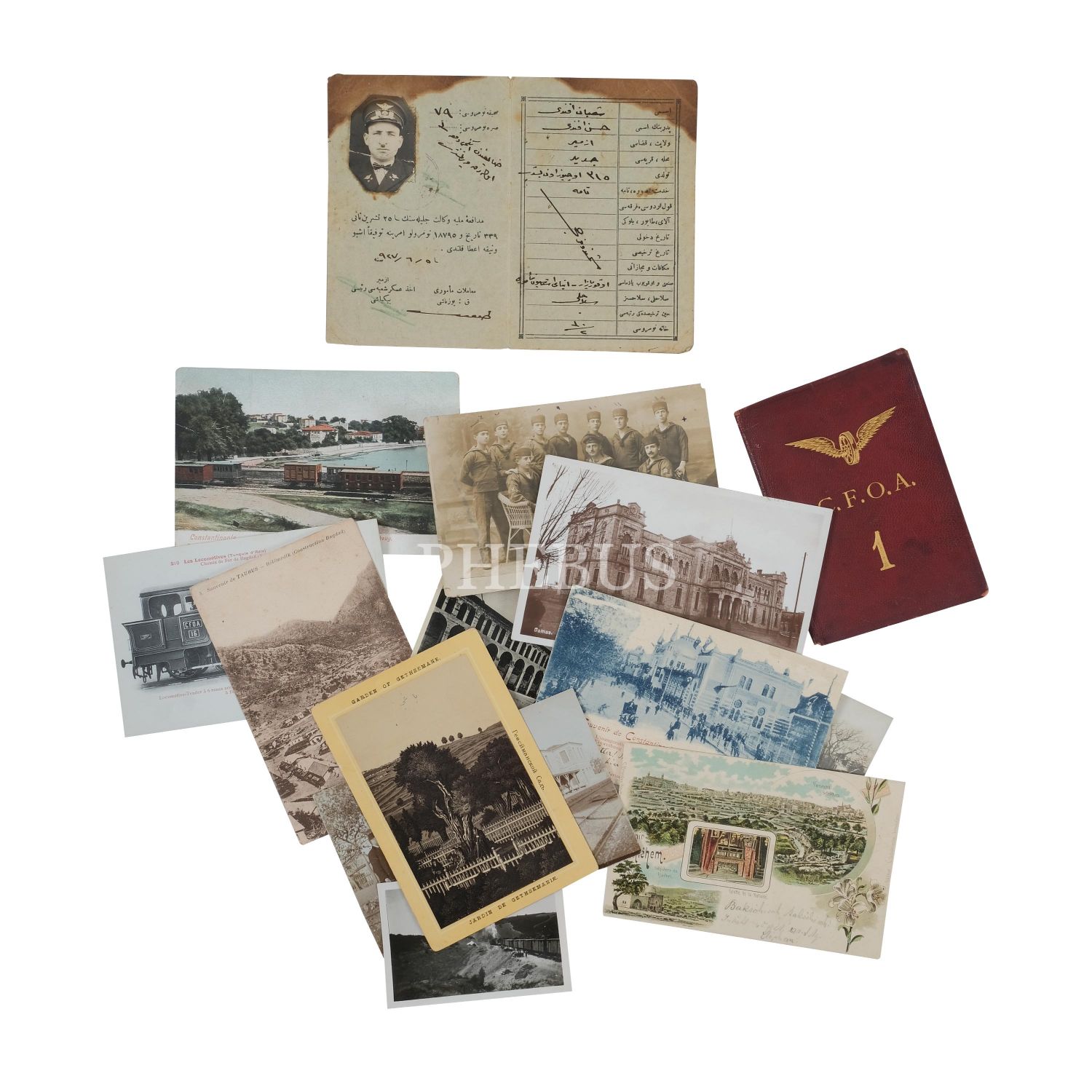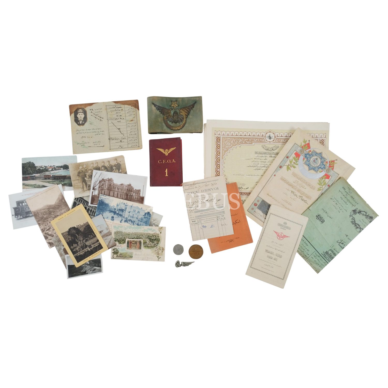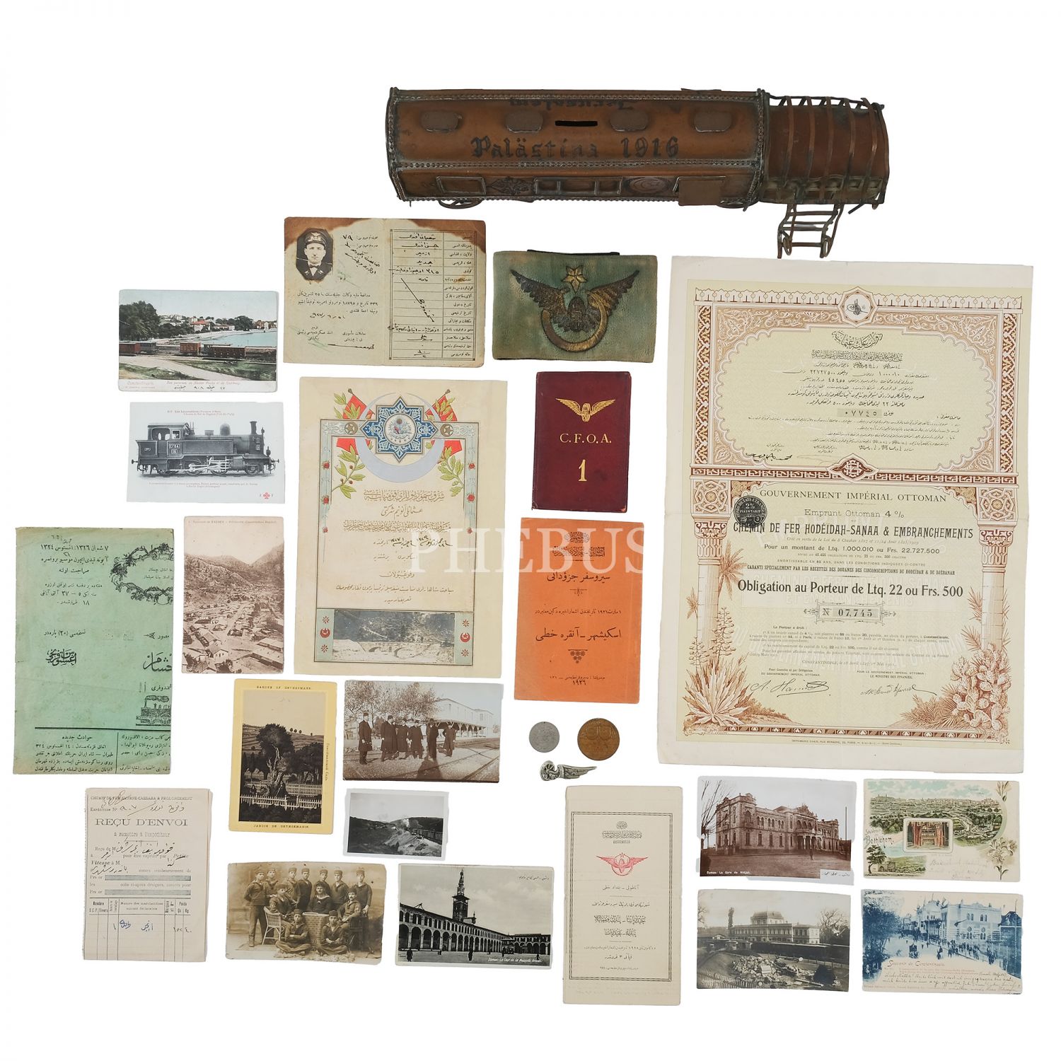 Üzerinde "Palestina - Jarusalem 1916" yazılı bir vagonun metal maketini ile Osmanlı ve Cumhuriyet dönemlerinde demiryolu taşımacılığına ve demiryolu tarihine dair çok sayıda evrak, madalya, fotoğraf, bilet, hisse senedi ve benzeri yazılı ve görsel materyal içeren lot...