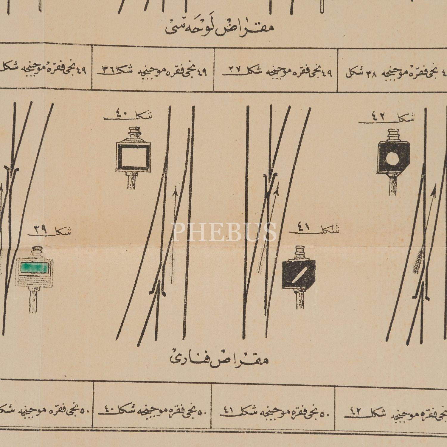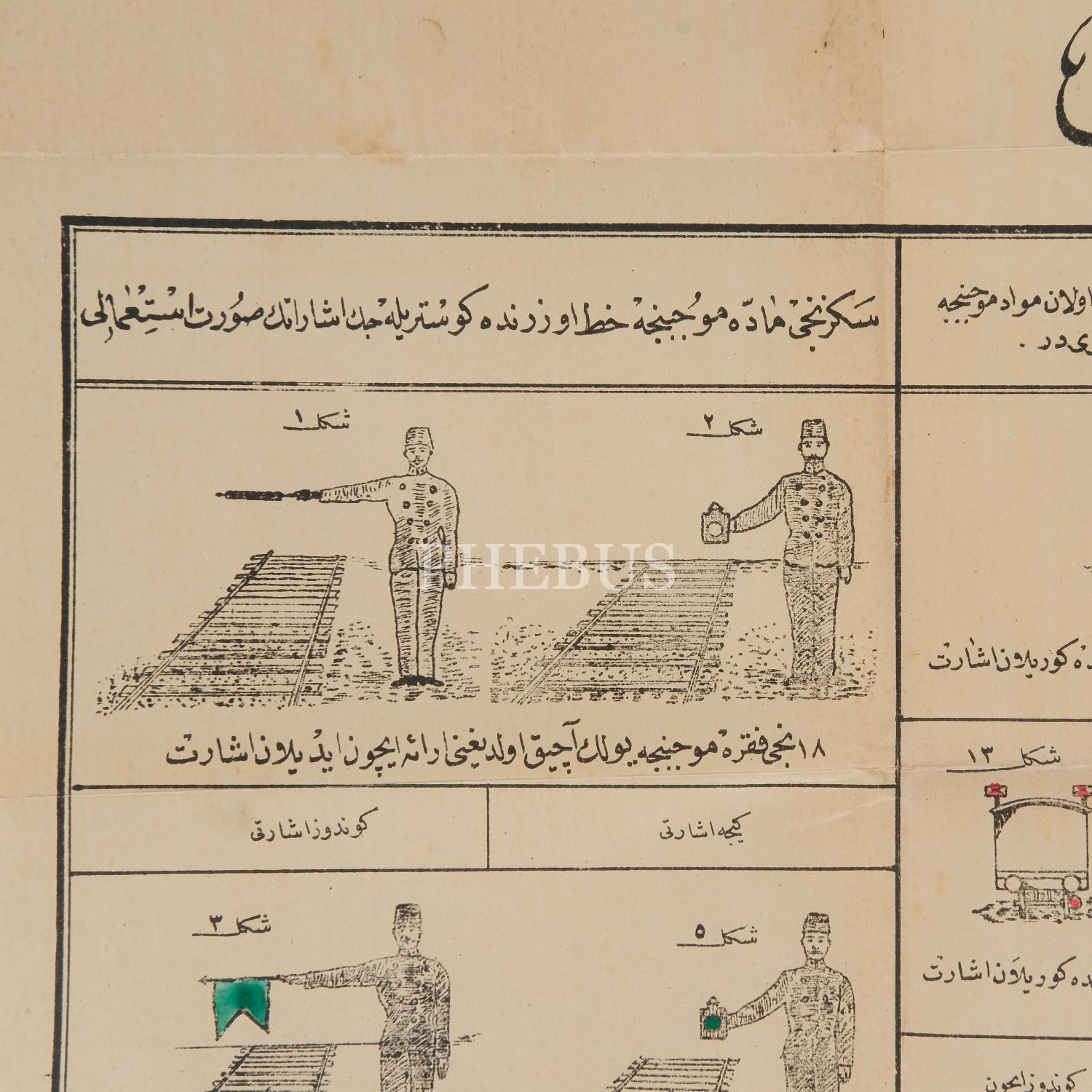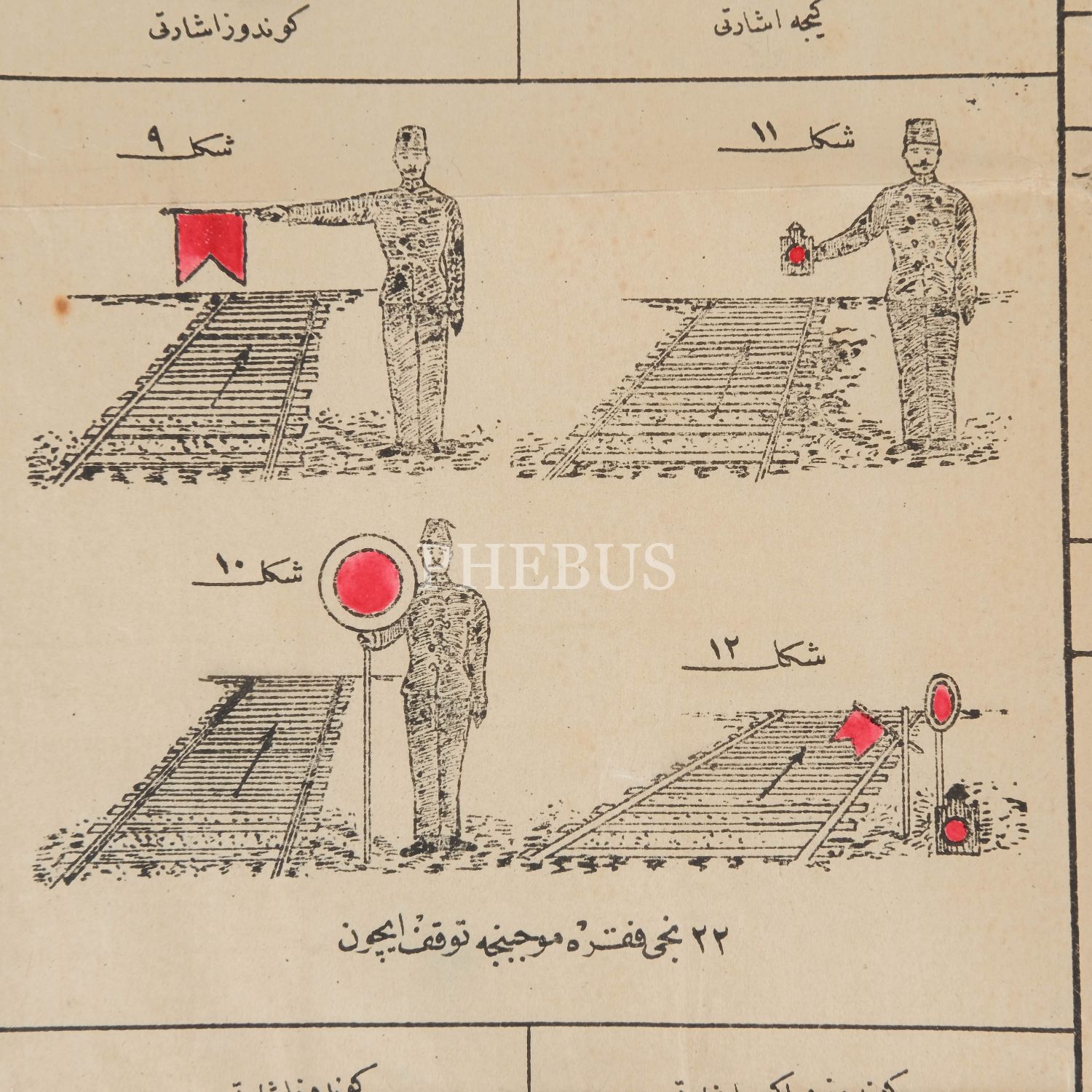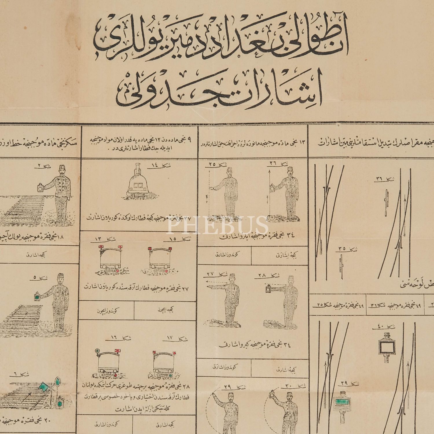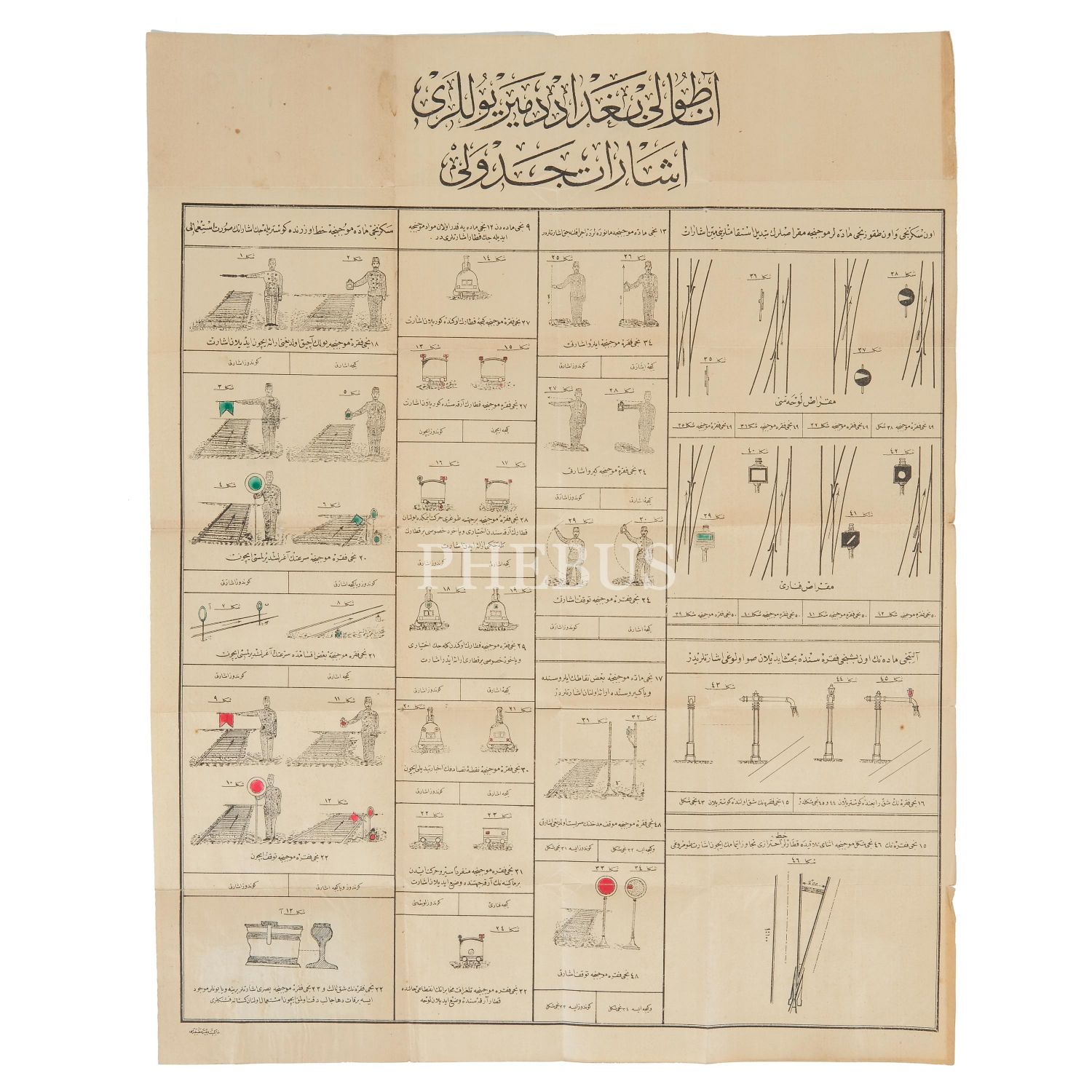 Anadolu-Bağdat Demiryolları´nda, çeşitli senaryolarda uyulması gereken kuralların resmedilerek gösterildiği "ANADOLU-BAĞDAT DEMİRYOLLARI İŞARET CETVELİ" başlıklı Osmanlıca afiş, Hakimiyet-i Milliye Matbaası, 50x64 cm...