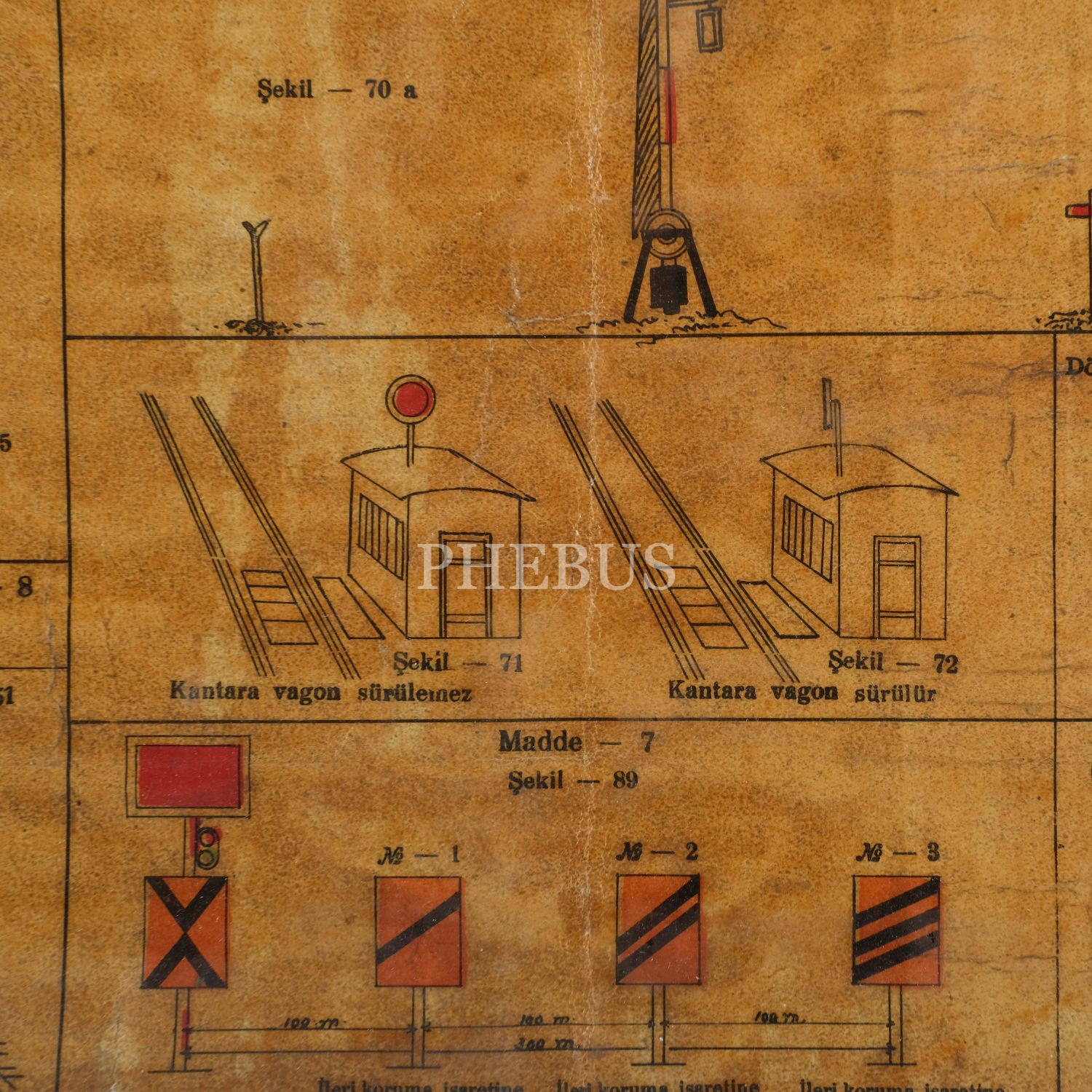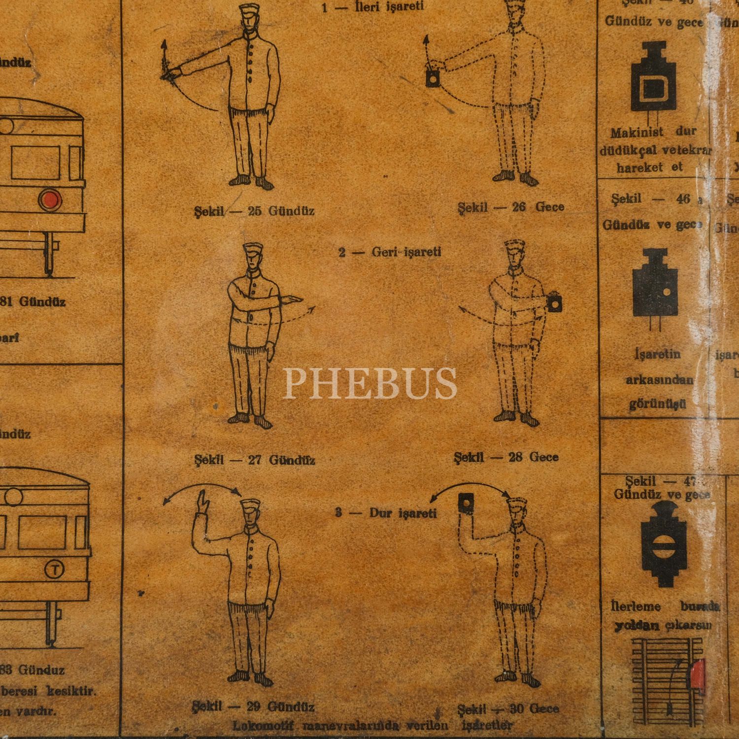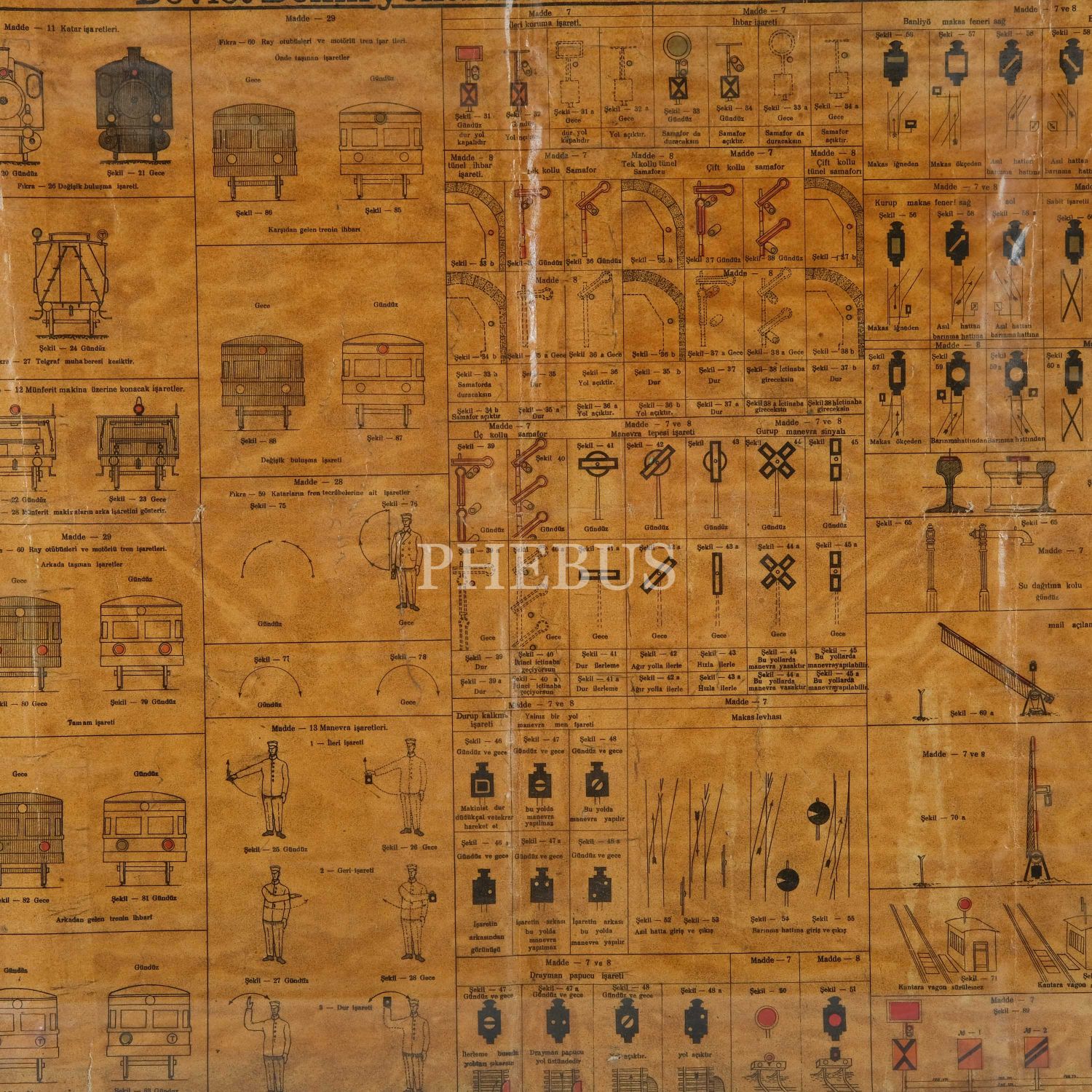 Devlet Demiryolları´nda, çeşitli senaryolarda uyulması gereken kuralların ve işaretlerin resmedilerek gösterildiği "DEVLET DEMİRYOLLARINDA KULLANILAN İŞARETLER" başlıklı afiş, 101x73 cm...