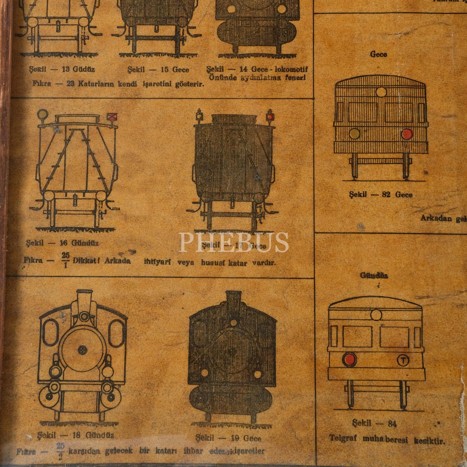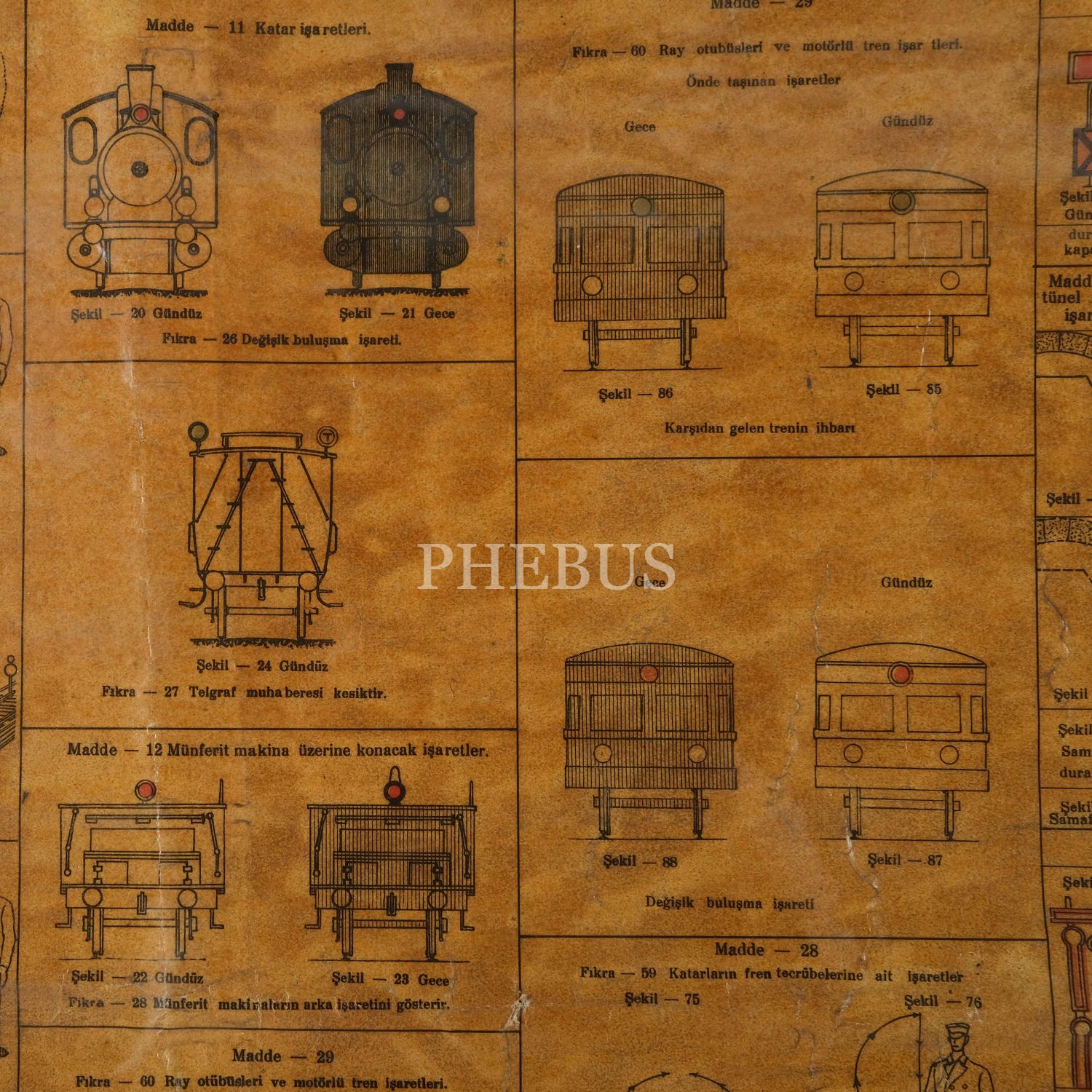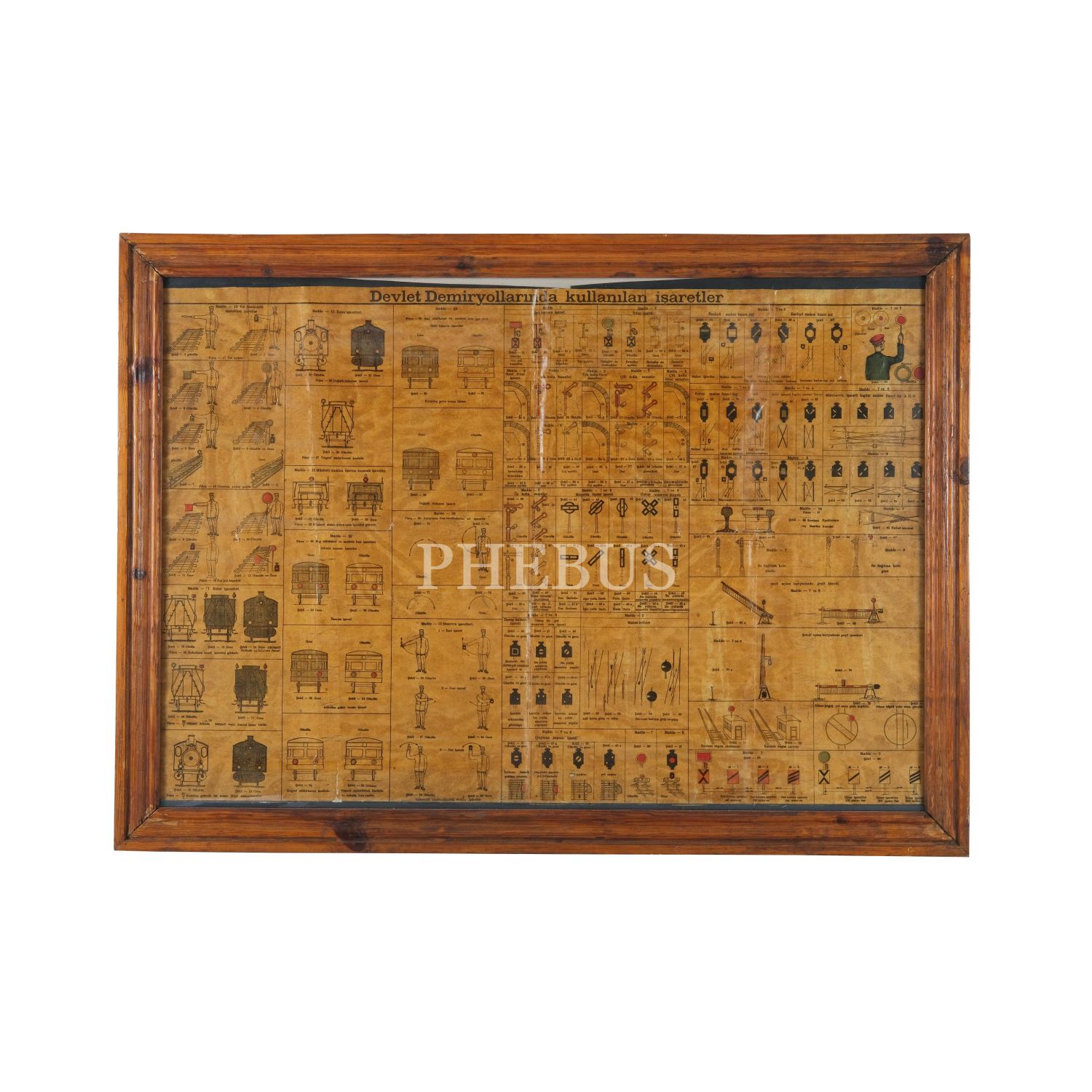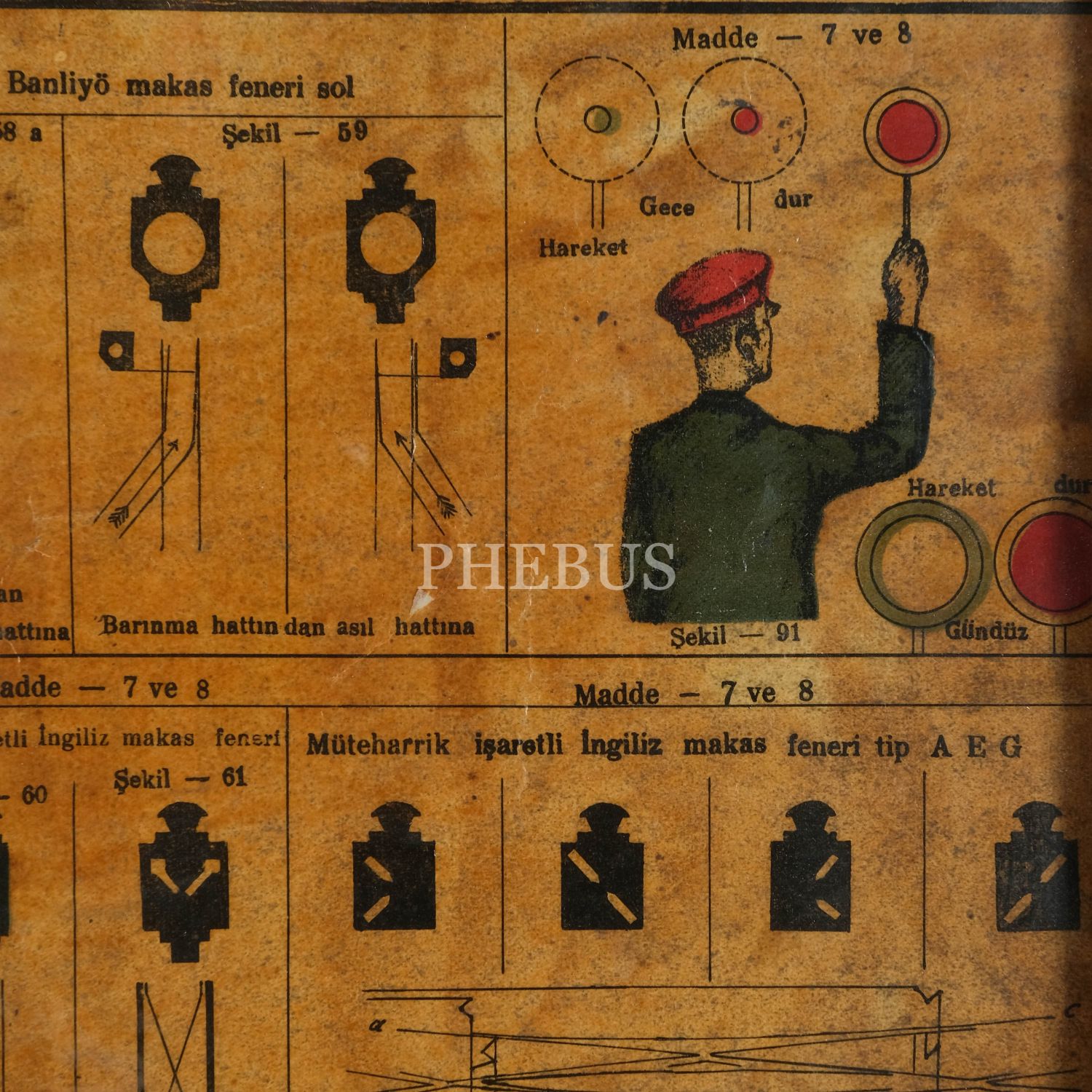 Devlet Demiryolları´nda, çeşitli senaryolarda uyulması gereken kuralların ve işaretlerin resmedilerek gösterildiği "DEVLET DEMİRYOLLARINDA KULLANILAN İŞARETLER" başlıklı afiş, 101x73 cm...