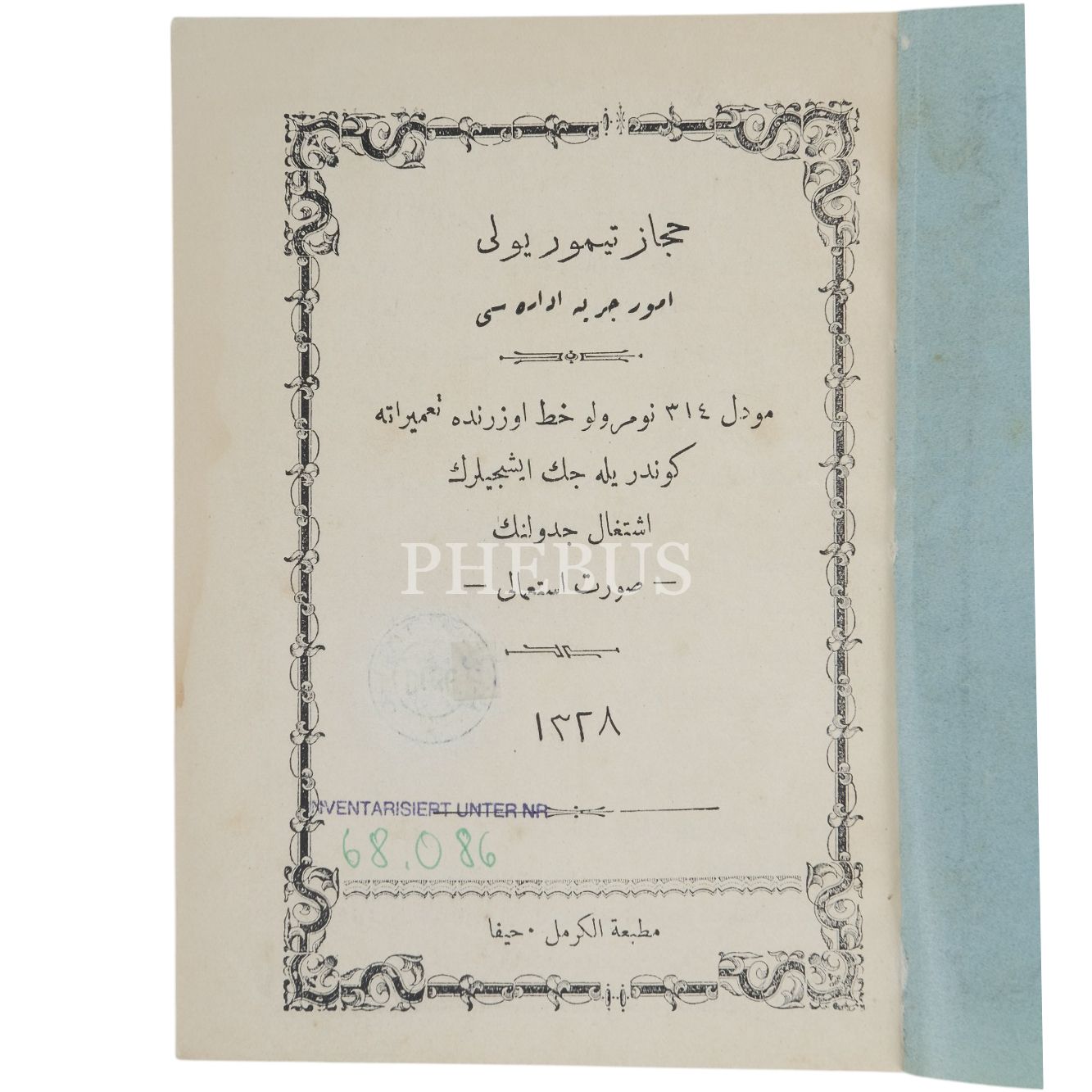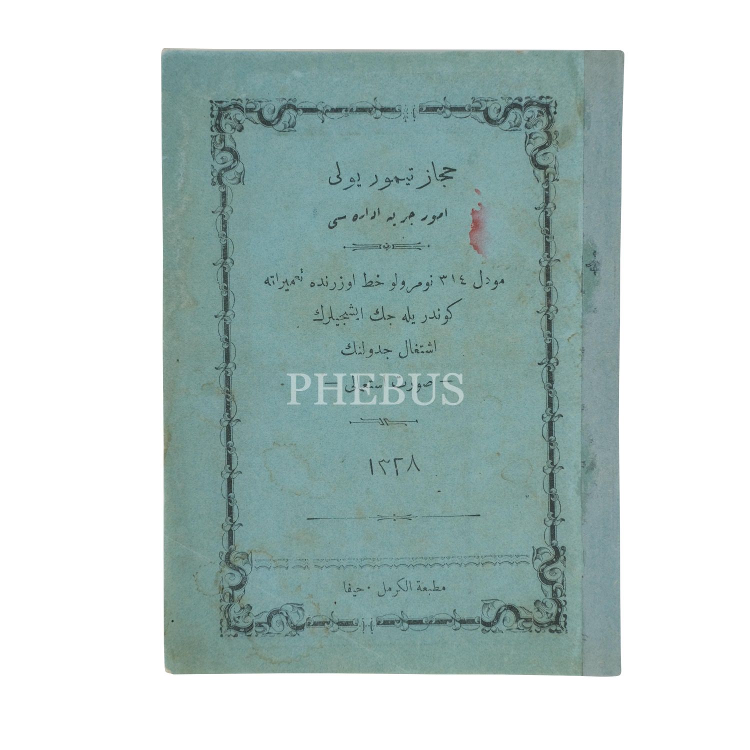 HİCAZ DEMİRYOLU UMUR-I CERİYYE İDARESİ (Model 314 numaralı hat üzerinde tamirata gönderilecek işçilerin iştigal cetvelinin suret-i isti´mali), 1328, Matbaat´ül-Kermil (Hayfa, İsrail), 16 sayfa + 1 adet katlanır çizelge, 12x16 cm...