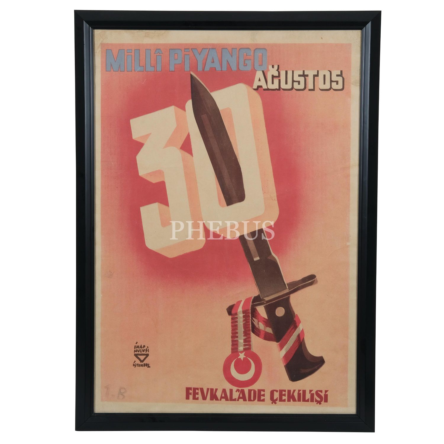 İhap Hulusi tarafından tasarlanan, "Milli Piyango 30 Ağustos Fevkalede Çekilişi" sloganlı afiş, 56x80 cm...
