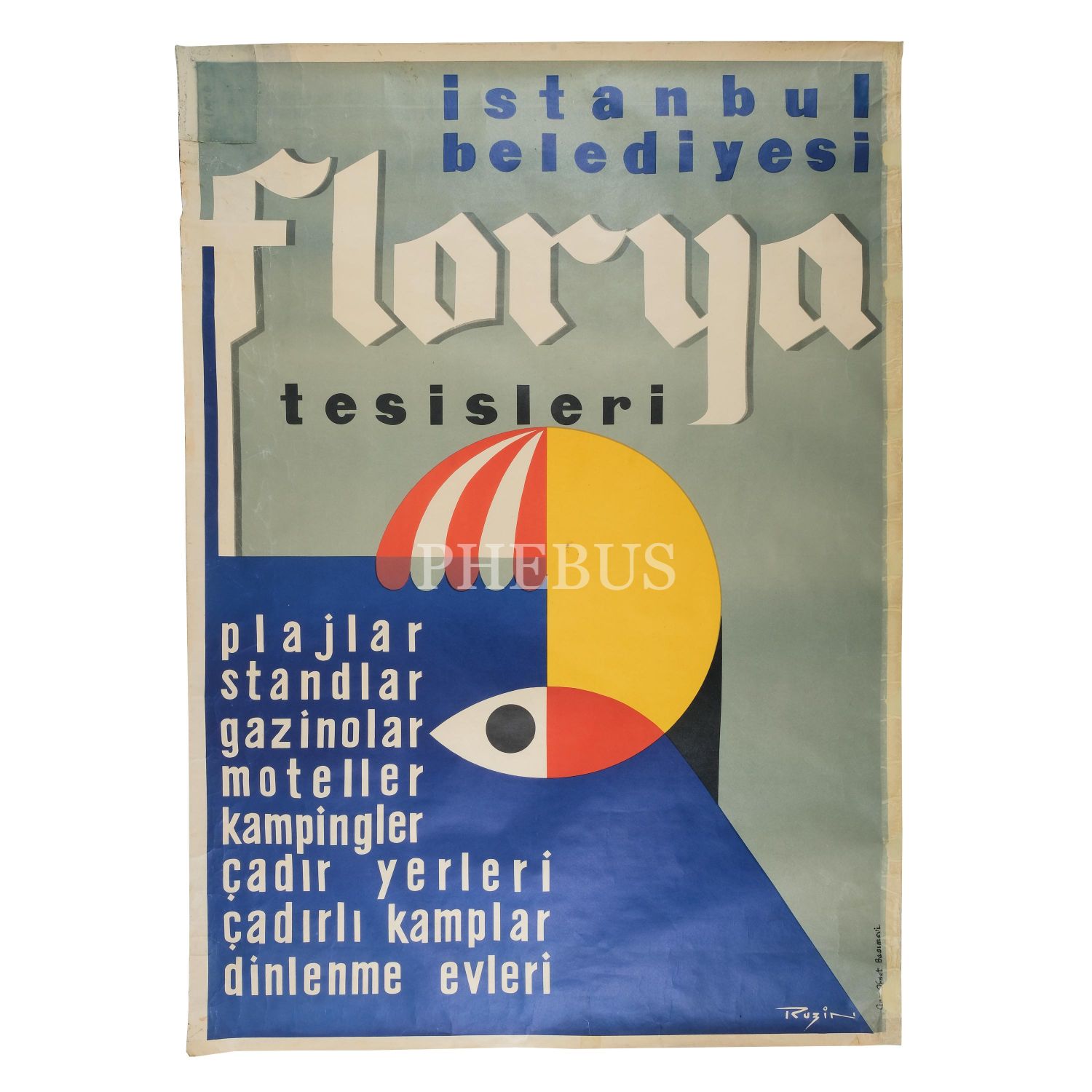 Ruzin Gerçin tasarımlı İstanbul Belediyesi Florya Tesisleri afişi, "Plajlar - Standlar - Gazinolar - Moteller - Kampingler - Çadır Yerleri - Çadırlı Kamplar - Dinlenme Evleri", Apa Ofset Basımevi, 90x125 cm...