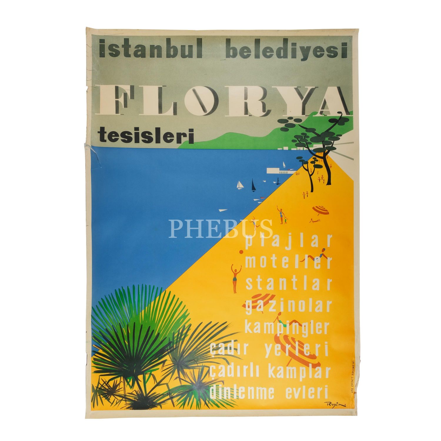 Ruzin Gerçin tasarımlı İstanbul Belediyesi Florya Tesisleri afişi, "Plajlar - Moteller - Stantlar - Gazinolar - Kampingler - Çadır Yerleri - Çadırlı Kamplar - Dinlenme Evleri", Apa Ofset Basımevi, 90x125 cm...