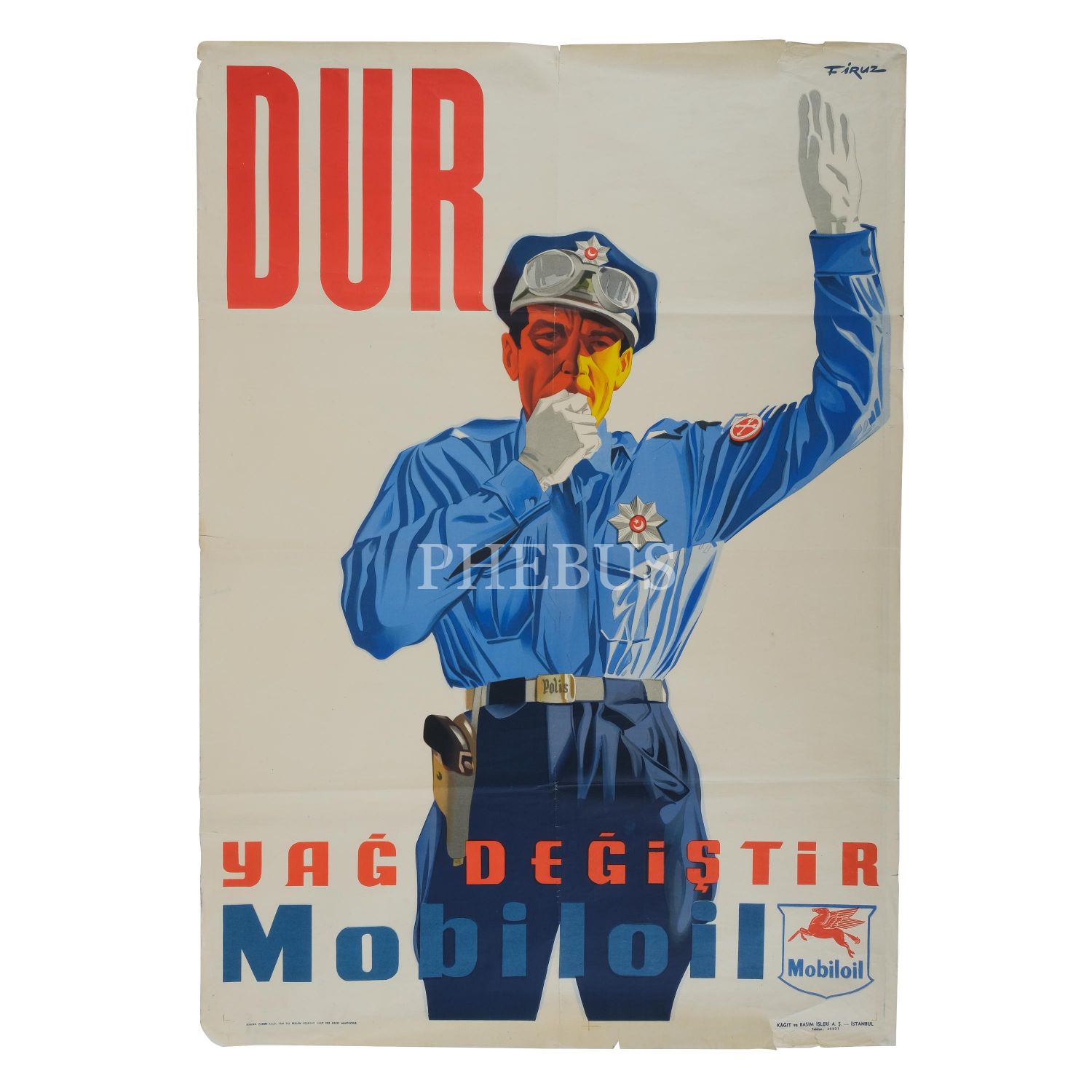 Firuz Aşkın tasarımı, Mobiloil firmasının polis görselli ve "Yağ değiştir" yazılı afişi, Kağıt ve Basım İşleri A.Ş, 70x100 cm...