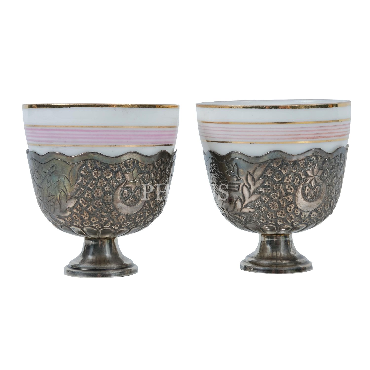 Osmanlı Devlet arması, tuğra ve ay ile yıldız işlemeli, Osmanlıca "sah" damgalı 2 adet gümüş zarf ve fincanlar, yükseklik 5, çap 5 cm...