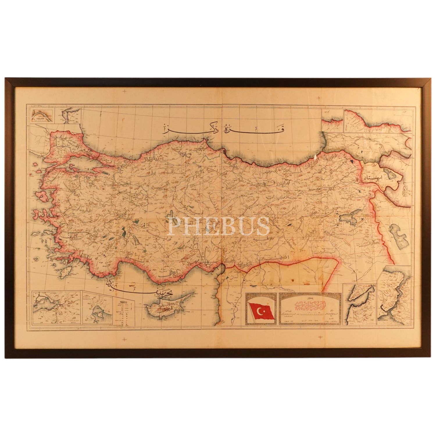 Trabzon Sultanisi Coğrafya Muallimi Yanyalı İzzettin Efendi´nin hazırladığı, 1923 senesi "Yeni Türkiye Haritası", Kitapçı Hamdi ve Mahdumları Matbaası (Trabzon), 126x80 cm...