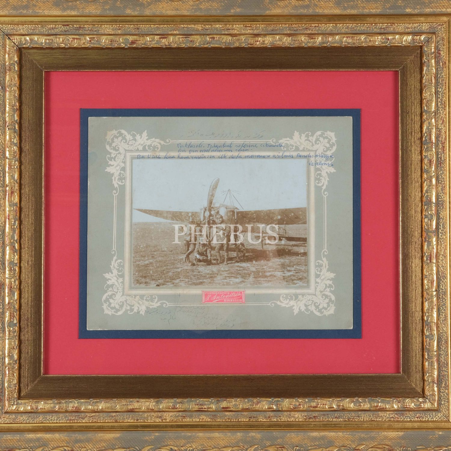 Kemal Bey ve Salim Bey´in, Marmara Denizi´ni geçtikleri tarihi uçuştan bir gün önce, arkadaşları Tahsin Bey ile birlikte tayyareleri önünde çekilen hatıra fotoğrafı, fotoğraf 26x22 cm, çerçeve 56x51 cm...