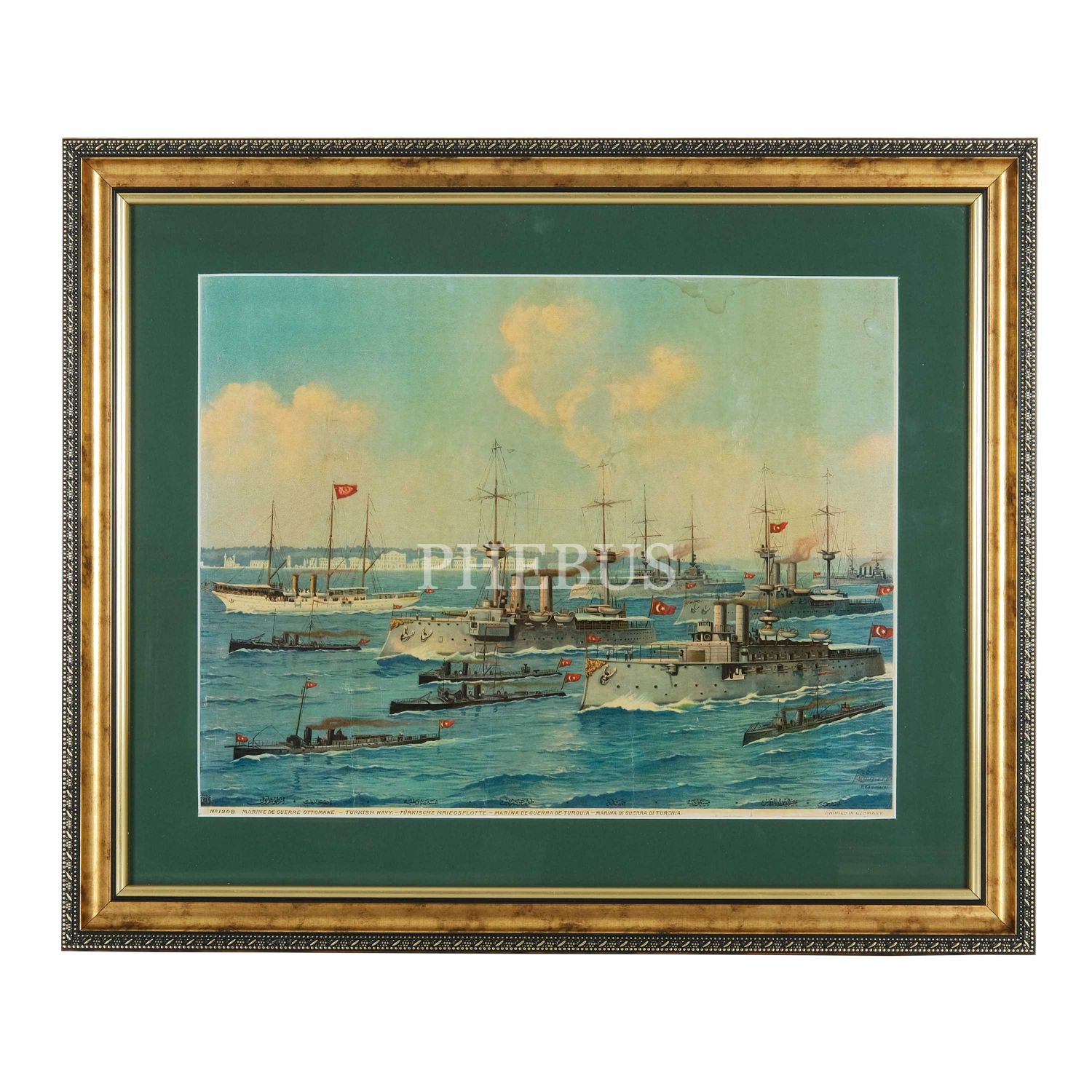 I. Dünya Savaşı sırasında Çanakkale Muharebeleri´nde, Türk topçu bataryaları tarafından dövülen Anzak donanmasının resmedildiği afiş ve Dolmabahçe Sarayı önünden geçen Ertuğrul, Yadigar-ı Millet, Gayret-i Vataniye, Turgut Reis, Haidiye, Mesudiye, Hayreddin Barbaros ve Numune-i Hamiyet zırhlılarından oluşan Osmanlı Donanması´nın resmedildiği afiş, her biri 58x48 cm...