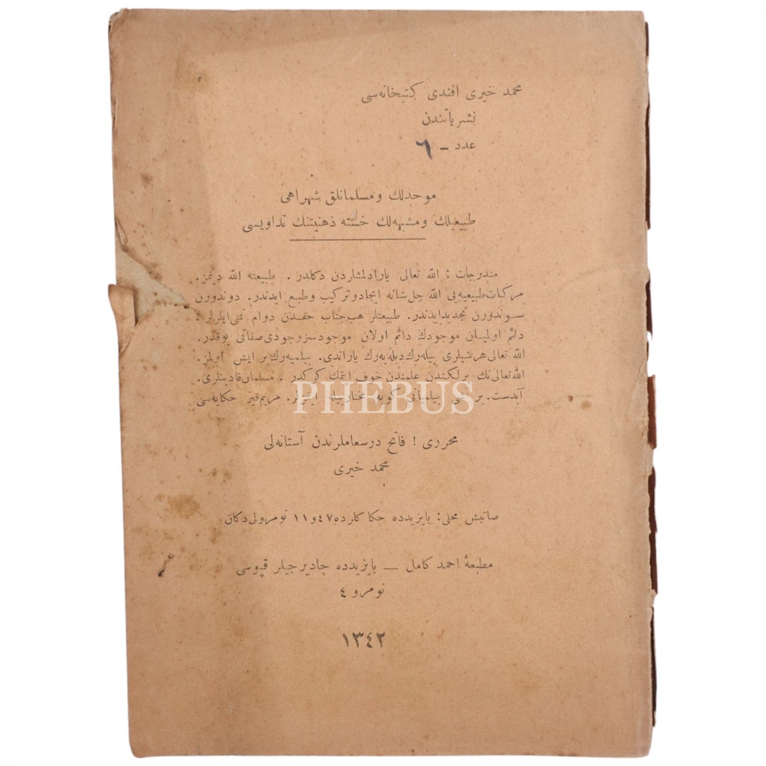 MUVAHİDDLİK VE MÜSLÜMANLIK ŞEHRAHI TABİİYELİK VE MÜŞEBBİHELİK HASTA ZİHNİYETİNİN TEDAVİSİ, Mahmud Hayri Efendi,1342, Mahmud Hayri Efendi Matbaası, 112 sayfa, 14x20cm...