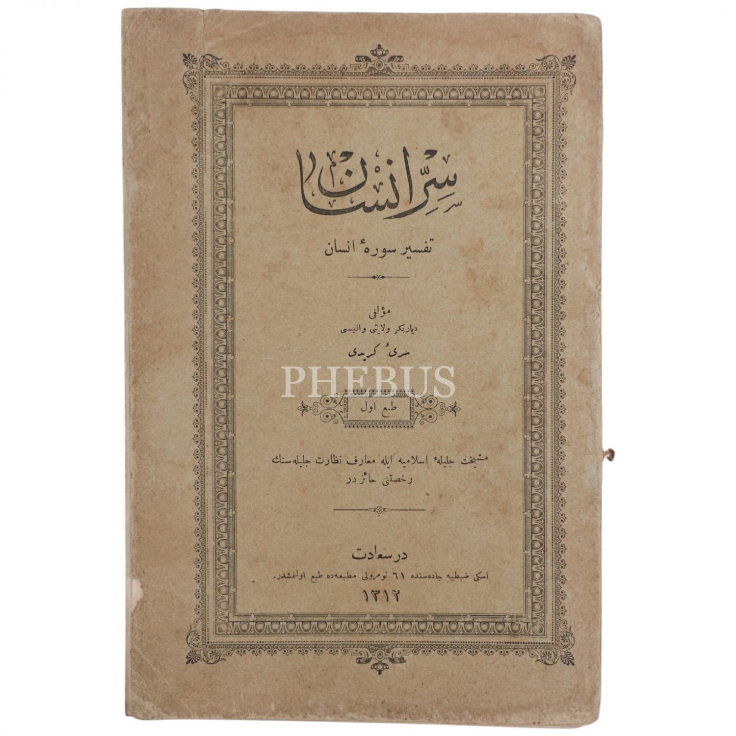 SIRR-I İNSAN (TEFSİR-İ SURE-İ İNSAN), Giritli Sırrı Paşa, 1312, Eski Zabtiye Caddesi 61 numaralı Matbaa, 237 sayfa, 14x21cm...