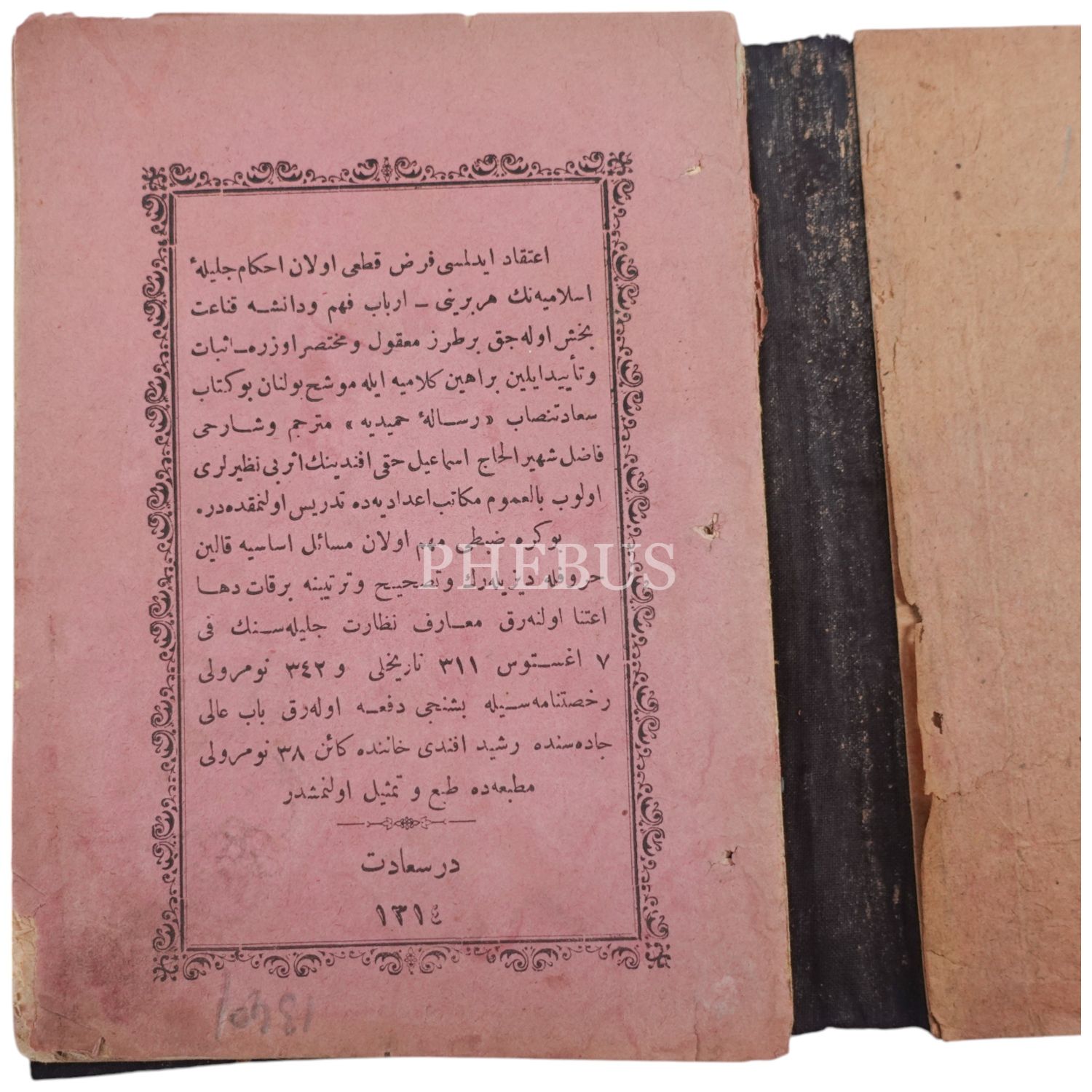Osmanlı´nın son döneminde askeri ve mülkiye liselerinde okutulmak üzere hazırlanan eser ilahiyyat , nübüvvet ve semiyat gibi konuları öğretmek amacıyla İsmail Hakkı Efendi tarafından yazılmıştır. *Eserin sırt kısmı ile formaları arası kopukluk vardır.