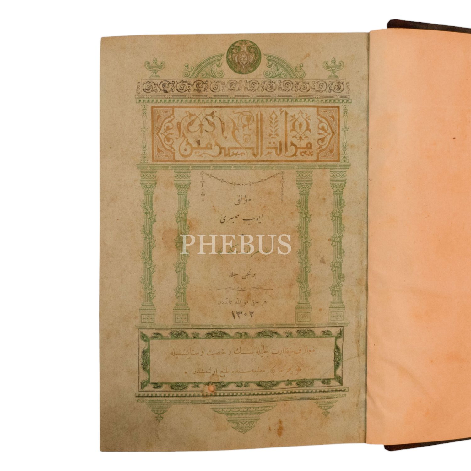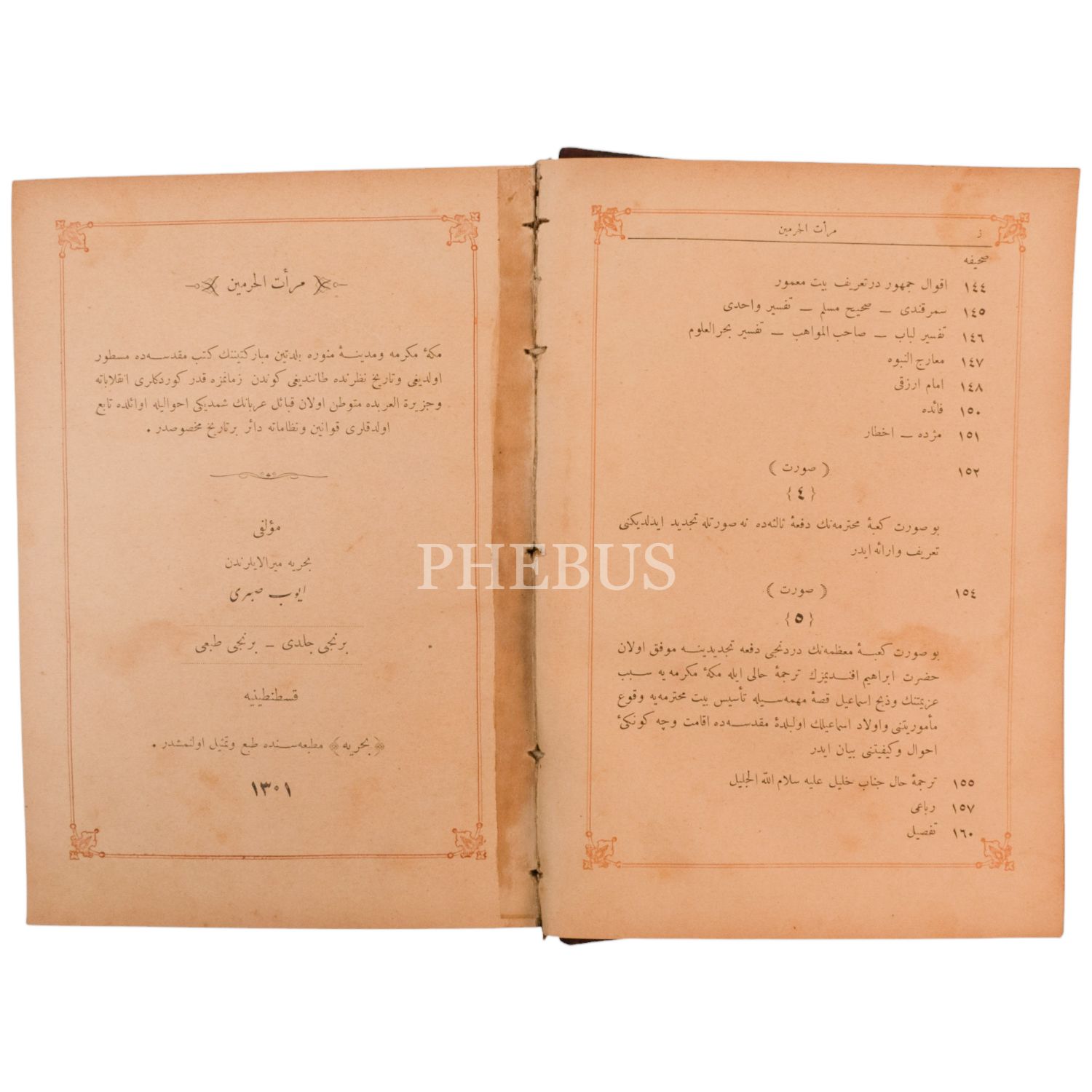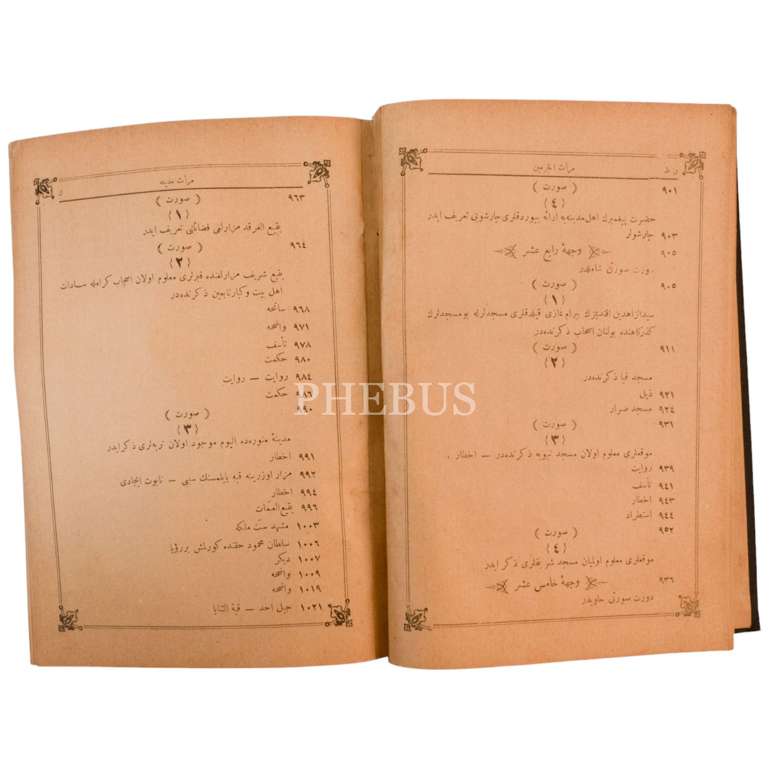Beş cilt bir arada tam takım Miratü'l-Harameyn. Mirat-ı Mekke, Mirat-ı Medine ve Mirat-ı Ceziretü'l-Arab olmak üzere tüm kısımları mevcuttur. Eser içindeki renkli ve siyah beyaz baskı tam sayfa görsellerin büyük kısmı mevcuttur. Görseller içinde az bir kısmı eksiktir.