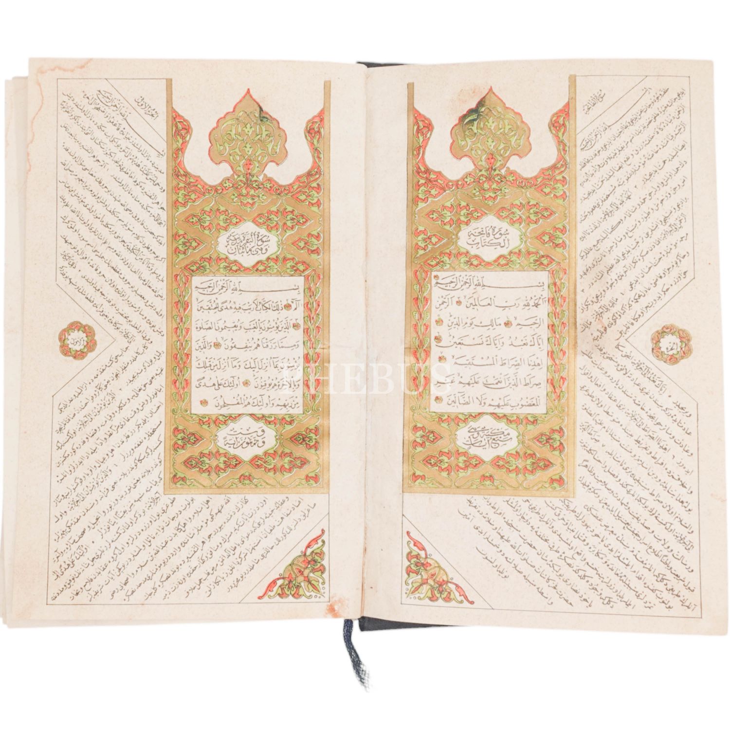 Sayfa ortasında Kuran-ı Kerim, sayfa kenarında Osmanlıca tefsir.