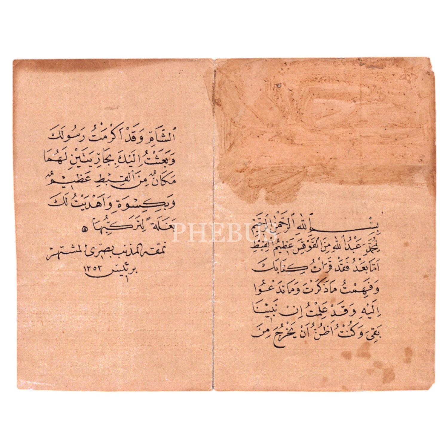 "Basrî el-Müştehir bi-Reis" ketebeli Arapça nesih, Mısır hükümdarı Mukavkıs´ın Hazreti Muhammed´e mektubunun metni, 1353 tarihli, 23x18 cm...