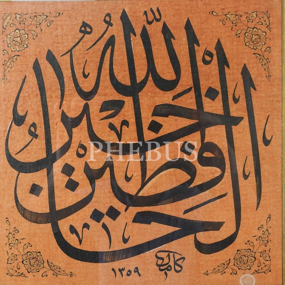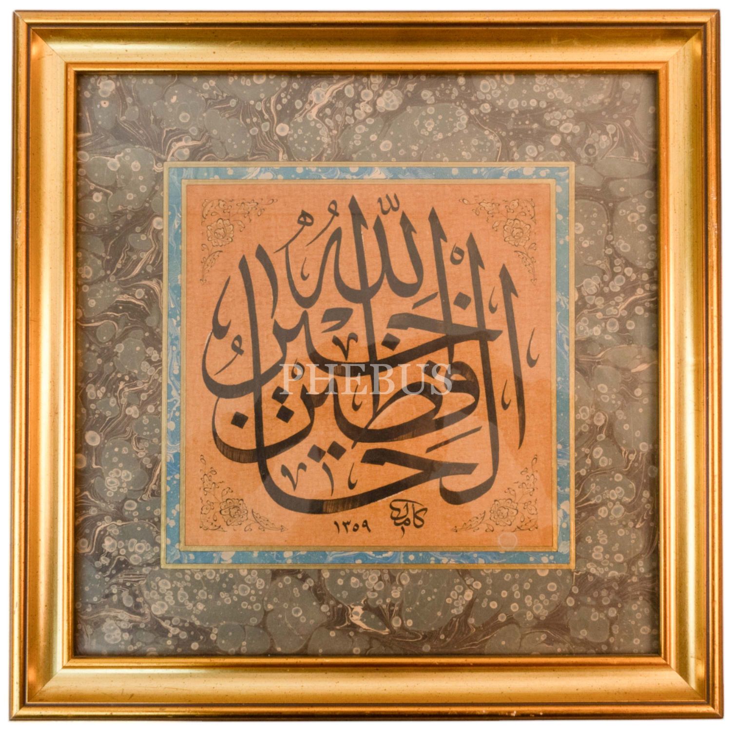 Kamil Akdik´ten takliden yazılmış celi sülüs istif yazı, 1359 tarihli, pervazında eski dönem ebru bulunmaktadır, 40x40 cm...