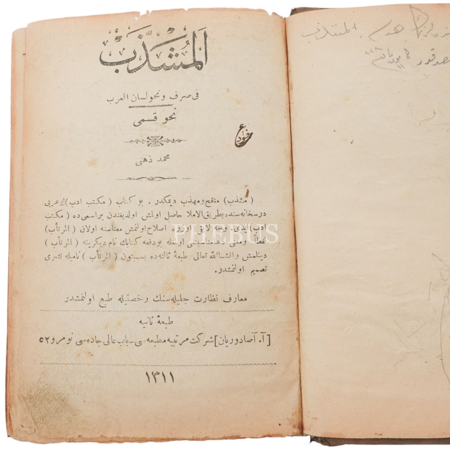 EL-MÜŞEZZEB NAHV KISMI, Mehmed Zihni, 1311, A. Asadutyan Şirket-i Mürettibiye Matbaası, 140 sayfa, 12x17 cm... NAZARİ VE AMELİ HENDESE (İKİNCİ KISIM), Salih Zeki, 1328, Karabet Matbaası, 247 sayfa. Arapça dilbilgisi ve Matematik ders kitapları birarada...
