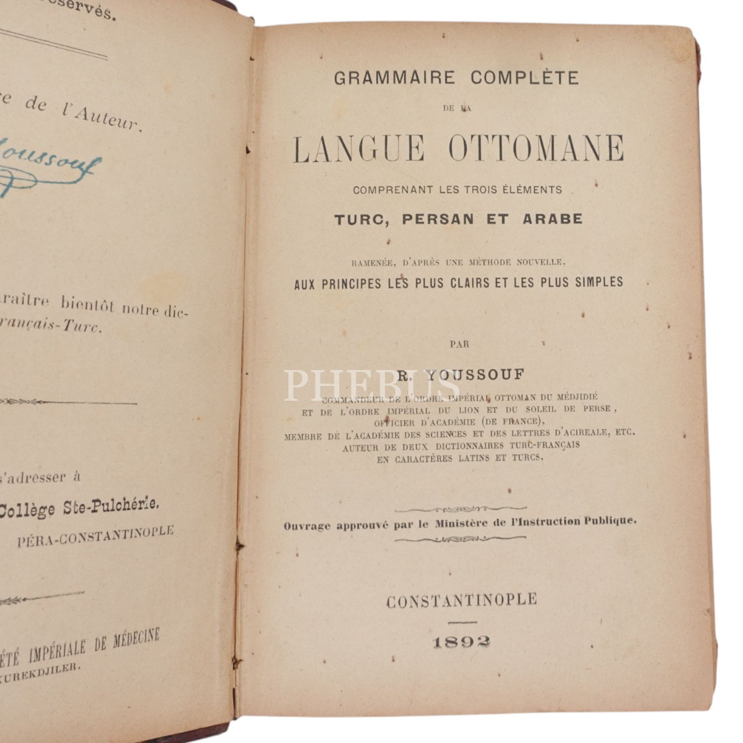 GRAMMAIRE COMPLETE DE LA LANGUAGE OTTOMANE, R.Youssouf, 1892, Constantinople, 340 sayfa, 13x18cm...