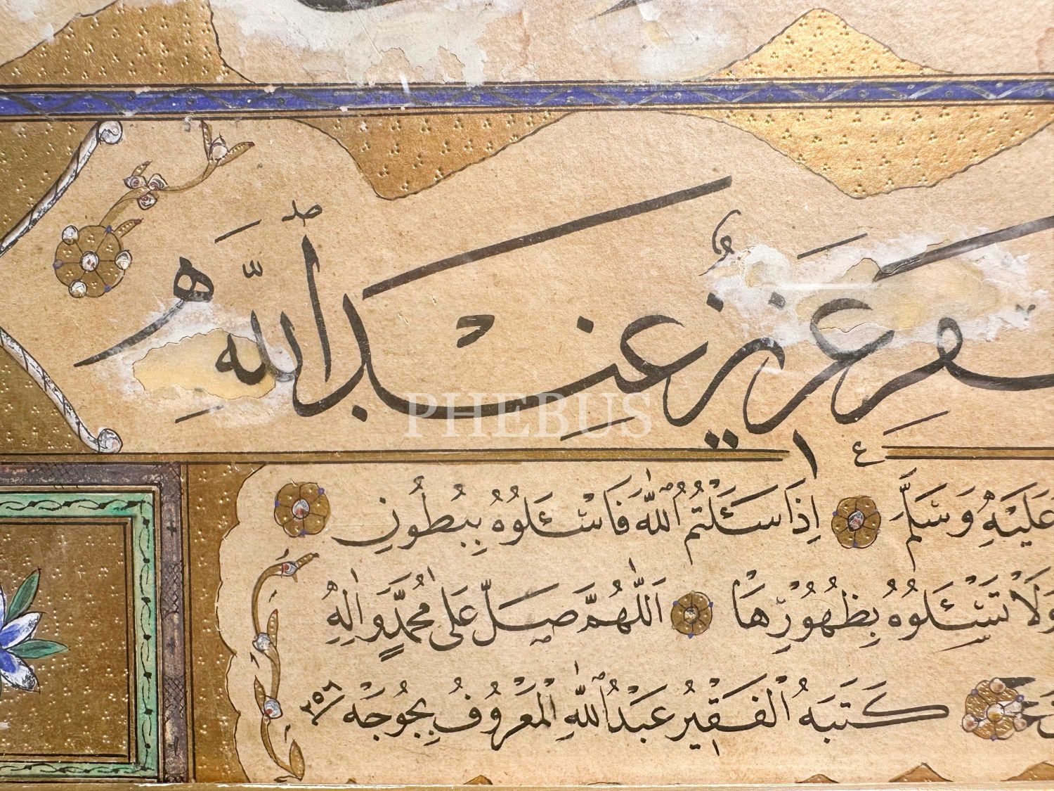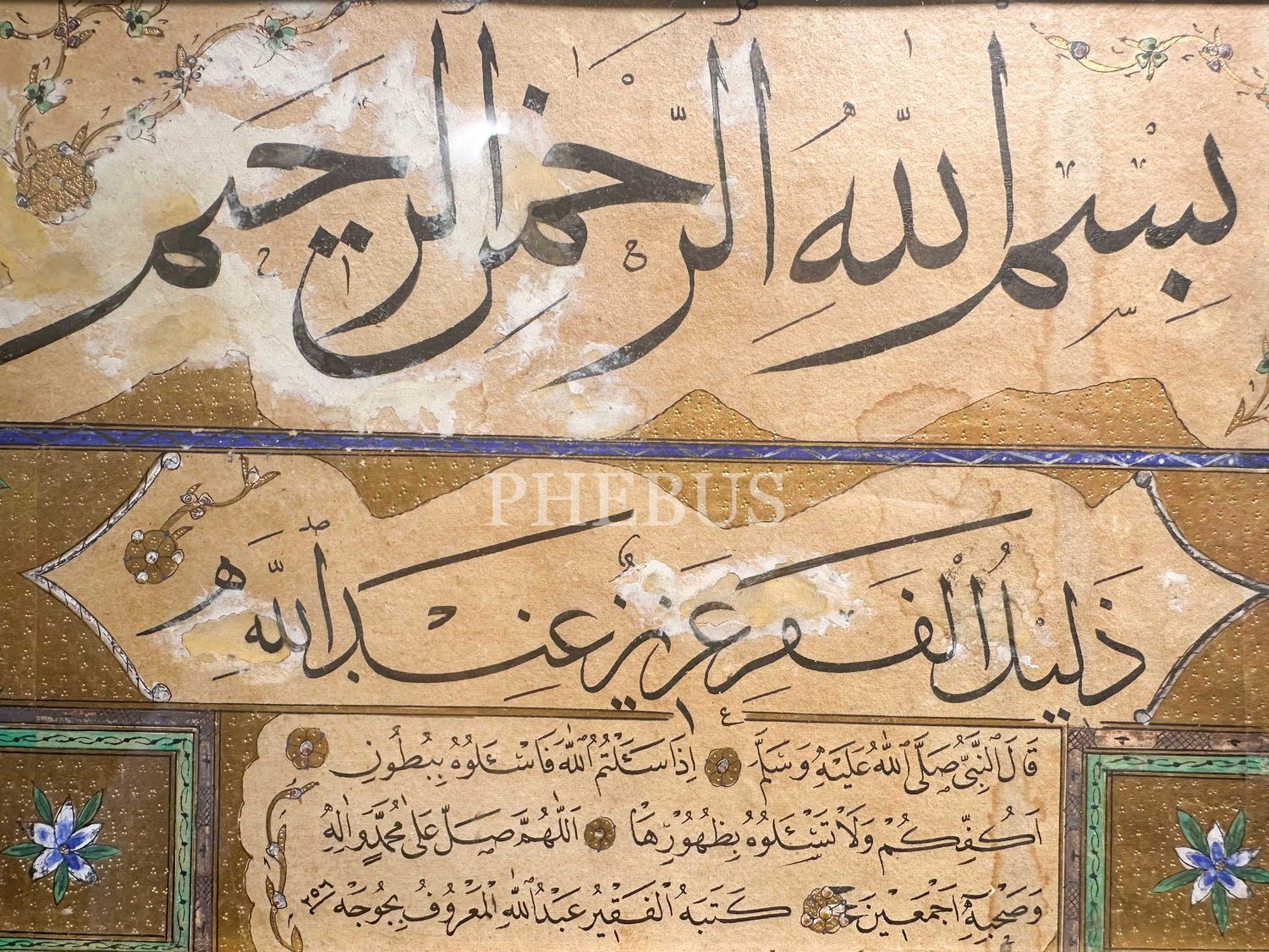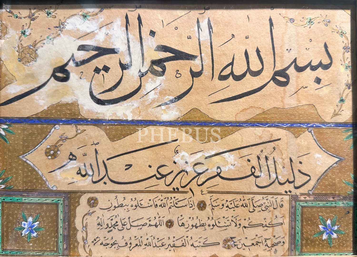 Cüce Abdullah Efendi ketebeli muhakkak-sülüs-nesih kıta, 1256 tarihli, çerçeve ölçü: 25x19 cm...
