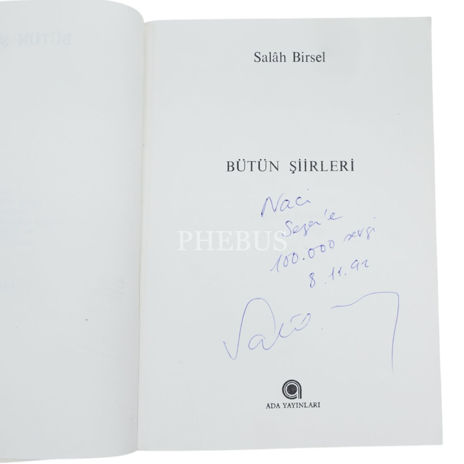 Salah Birsel´in tüm şiirleri bir arada... " Naci Sezen´e 100.000 sevgi" ithafıyla 8 Aralık 1992 tarihinde imzalanmıştır.