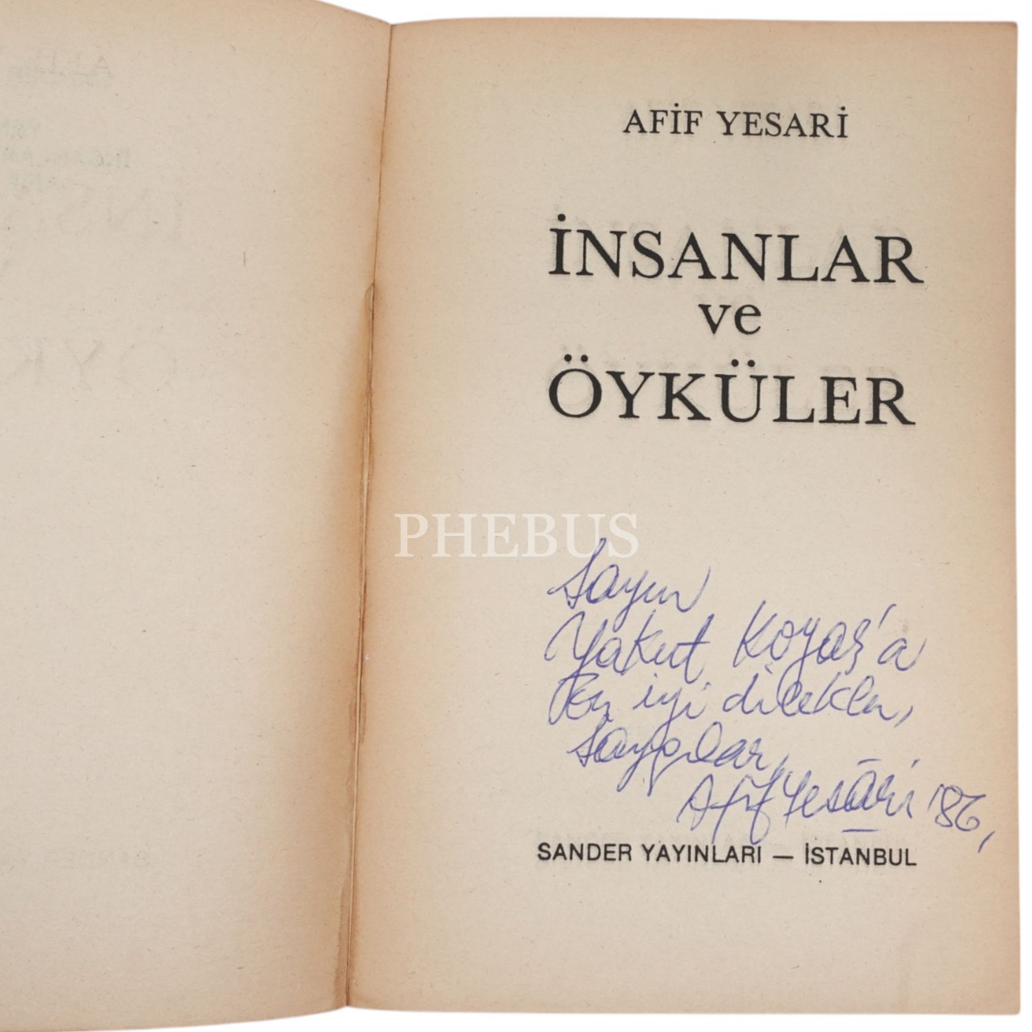 Hattat Yesarizadelerin torunu ve Mahmut Yesari´nin oğlu gazeteci-yazar Afif Yesari´nin 1945-1985 yılları arasındaki öyküleri... "Sayın Yakut Kayaş´a iyi dilekler, saygılar" ithafıyla 1986 tarihinde imzalanmıştır.