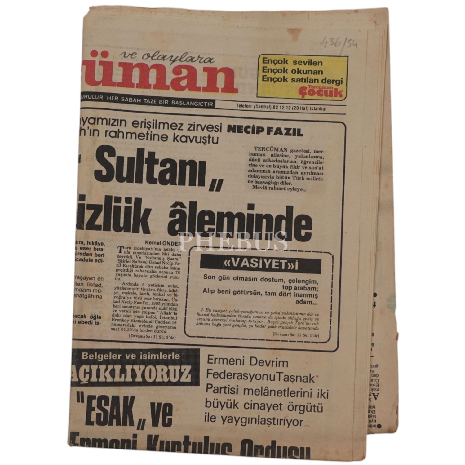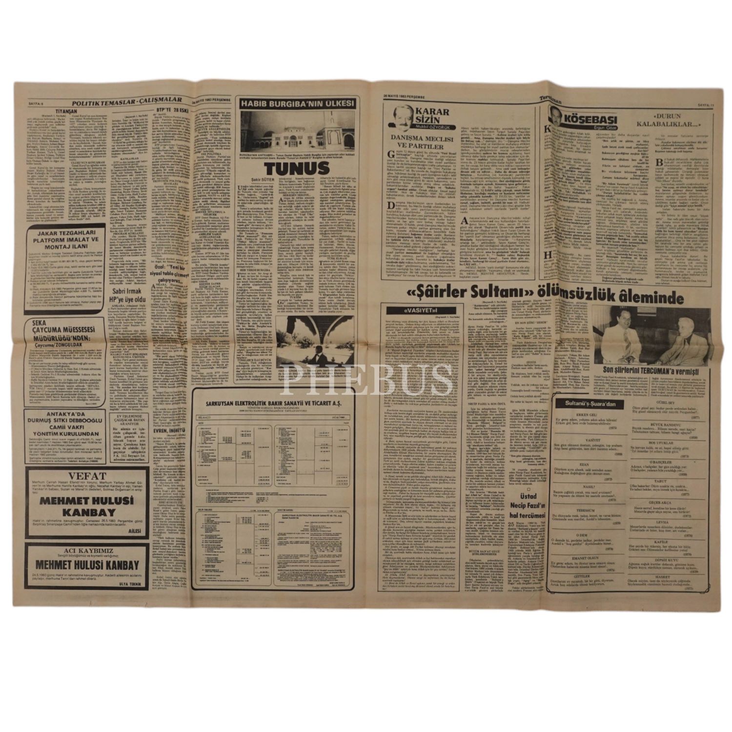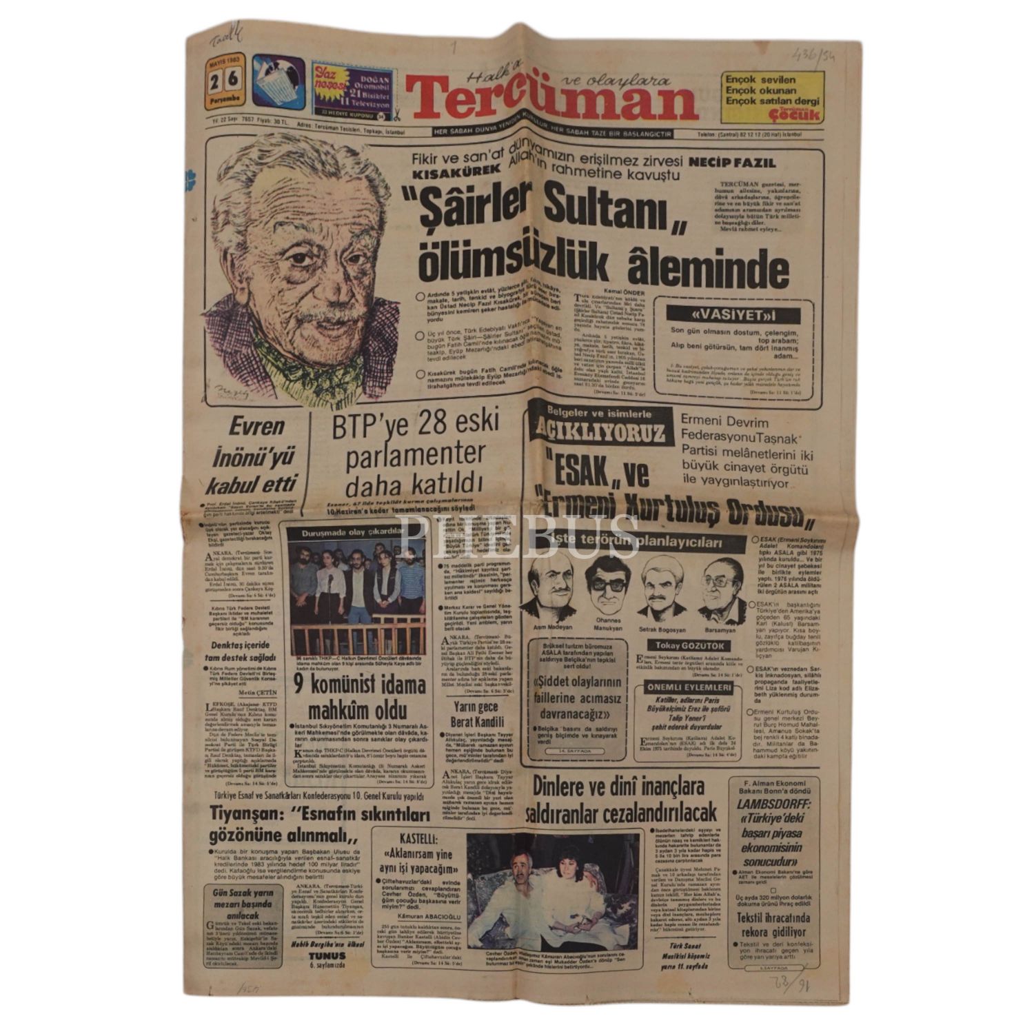 TERCÜMAN GAZETESİ, "ŞAİRLER SULTANI ÖLÜMSÜZLÜK ALEMİNDE" (Necip Fazıl Kısakürek´in Vefat Haberi), 1983, 26 Mayıs 1983 tarihli, 15 sayfa, 54x40 cm