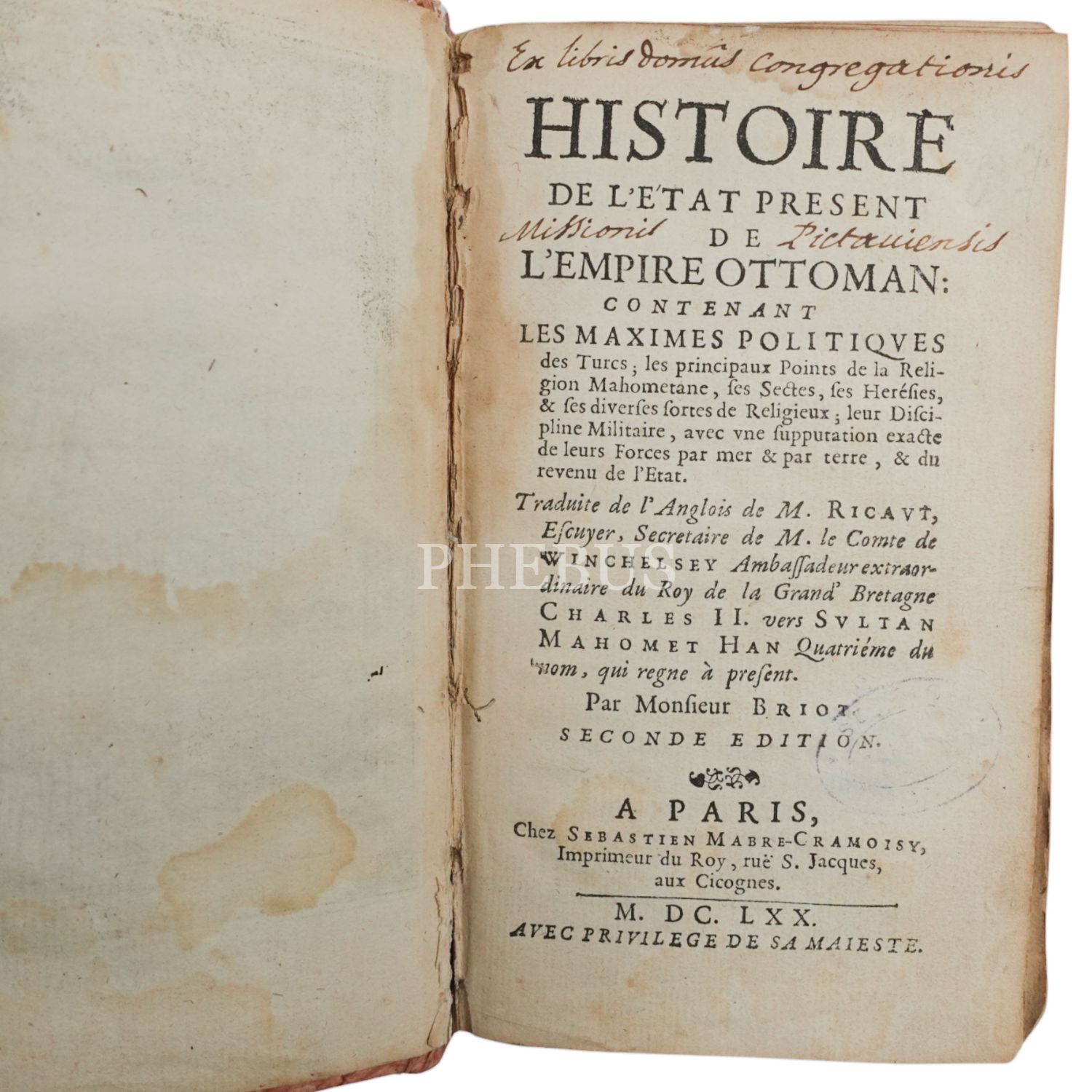 HISTORIE DE L´ETAT PRESENT DE L´EMPIRE OTTOMAN, Paul Rycaut, 1670, Chez Sebastien Mabre-Chramoisy, 661 sayfa, 10x17cm...