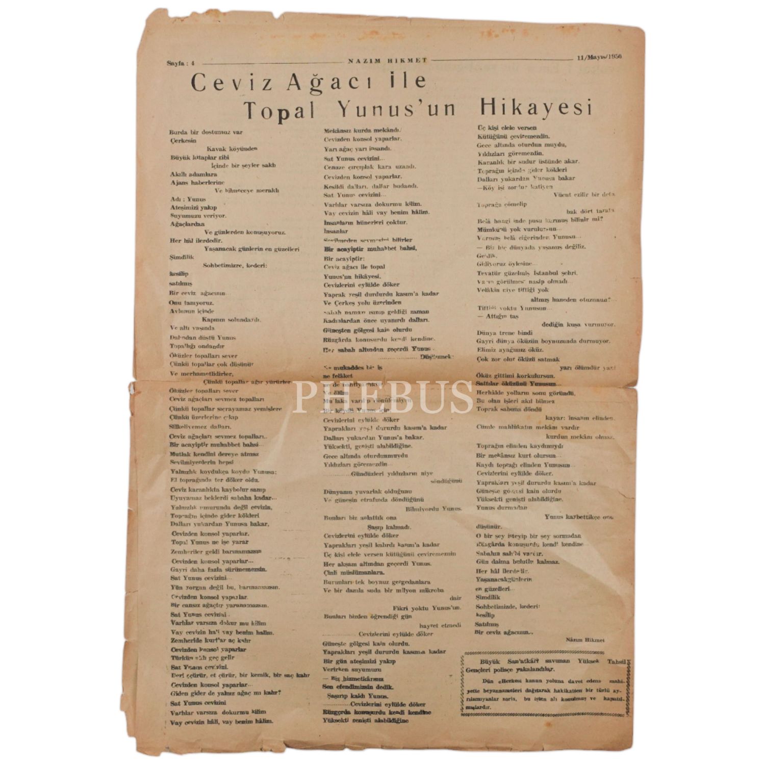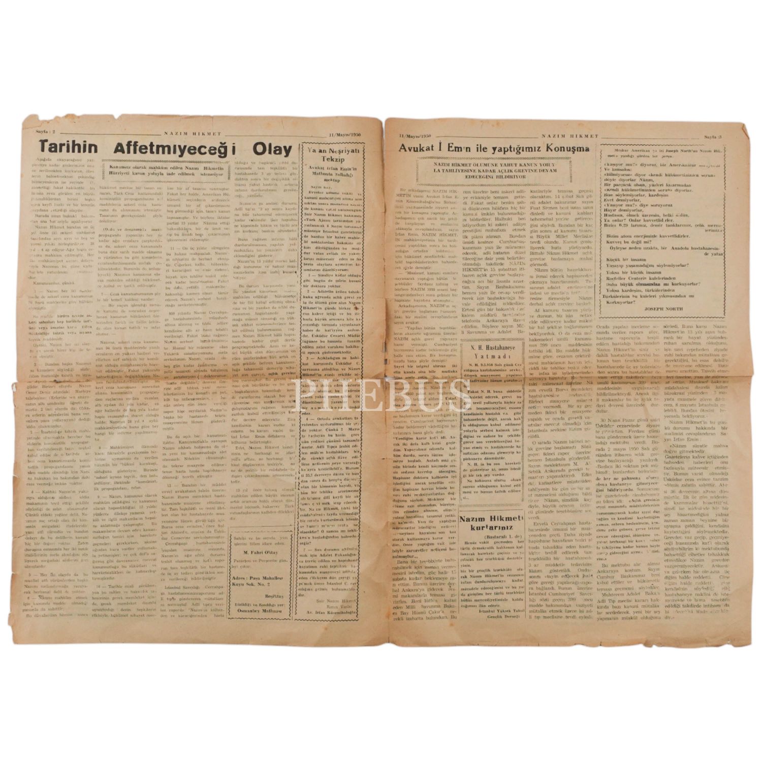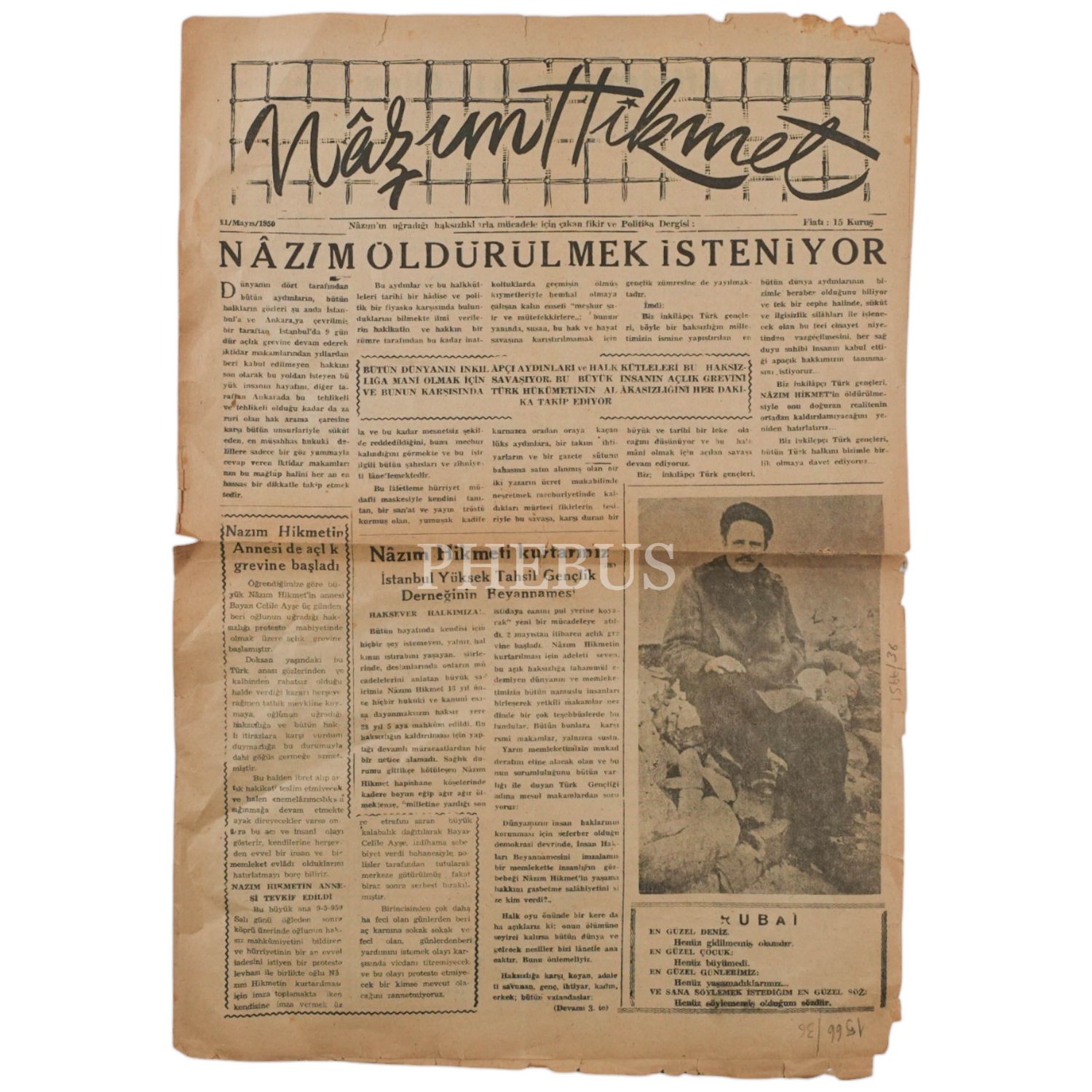 Nazım Hikmet´in 11 Mayıs 1950 tarihinde başladığı açlık grevi üzerine Nazım Hikmet´in sesini duyurmak maksadıyla M. Fahri Oktay tarafından çıkarılan NAZIM HİKMET gazetesinin "Nazım Öldürülmek İsteniyor" manşetli ilk nüshası, 11 Mayıs 1950, 4 sayfa, 41x29 cm...