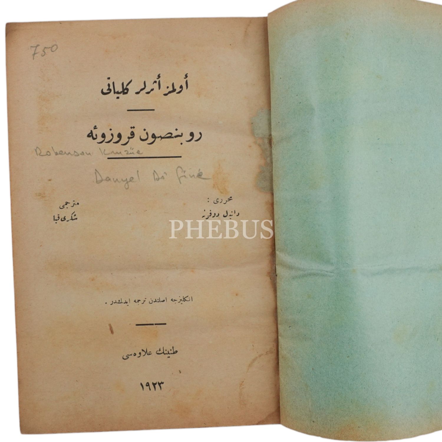 Osmanlıca Türkçesinde yapılan ilk Robinson Crusoe çevirilerinden... *Ön kapağının iç kısmı kısmen ayrık haliyle.