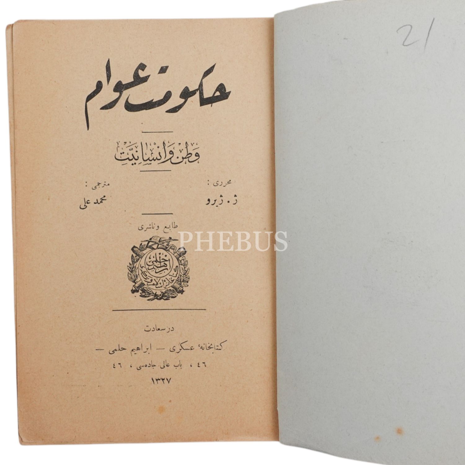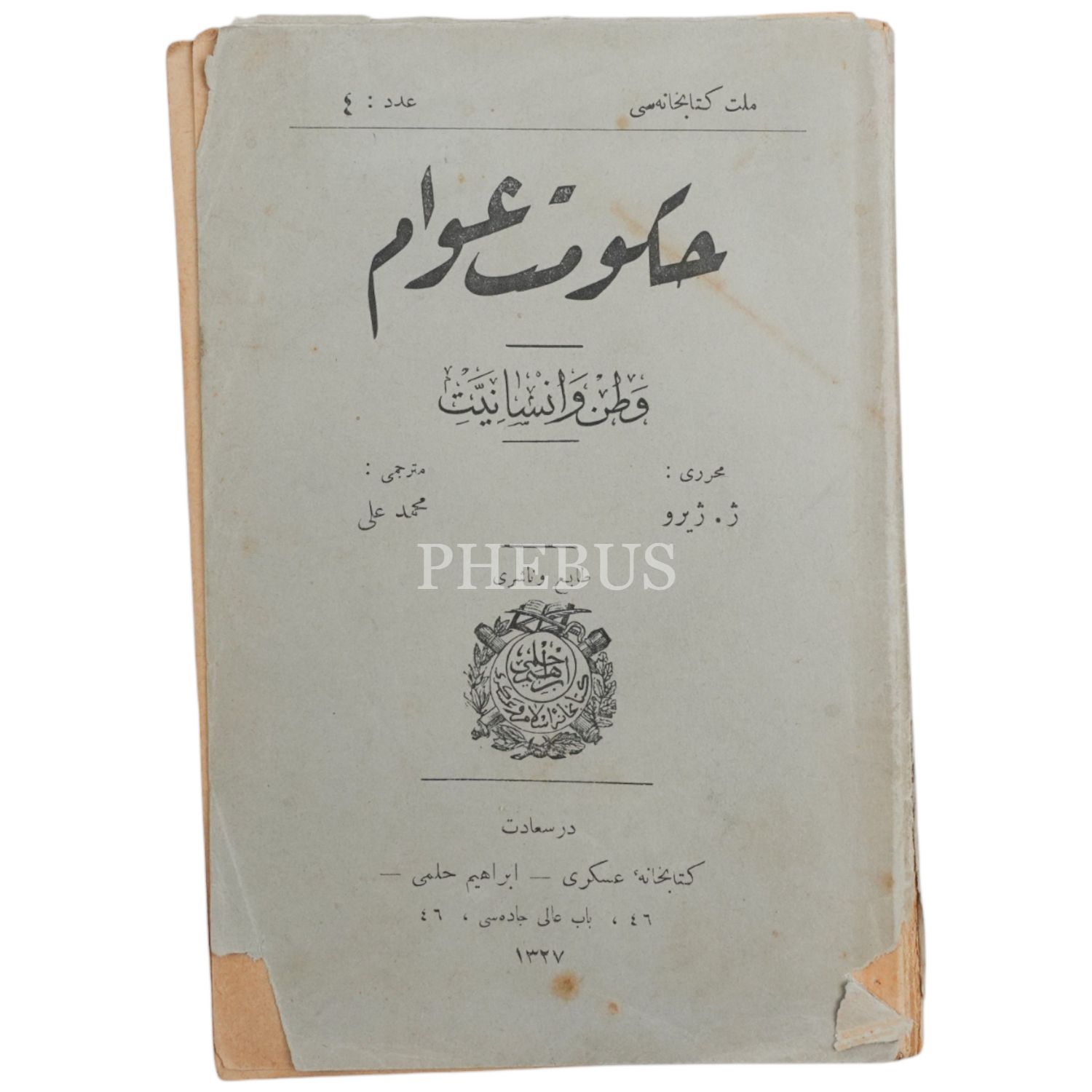 HÜKÜMET-İ AVAM: VATAN VE İNSANİYET, J. Giraud, (çeviren: Mehmed Ali), 1327, Kitabhane-i Askeri, 133 sayfa, 12x18 cm...