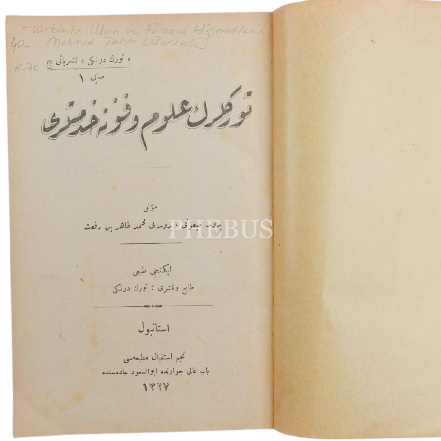TÜRKLERİN ULÛM VE FÜNÛNA HİZMETLERİ, Bursalı Mehmet Tahir, 1327, 48 sayfa, 19x13 cm...