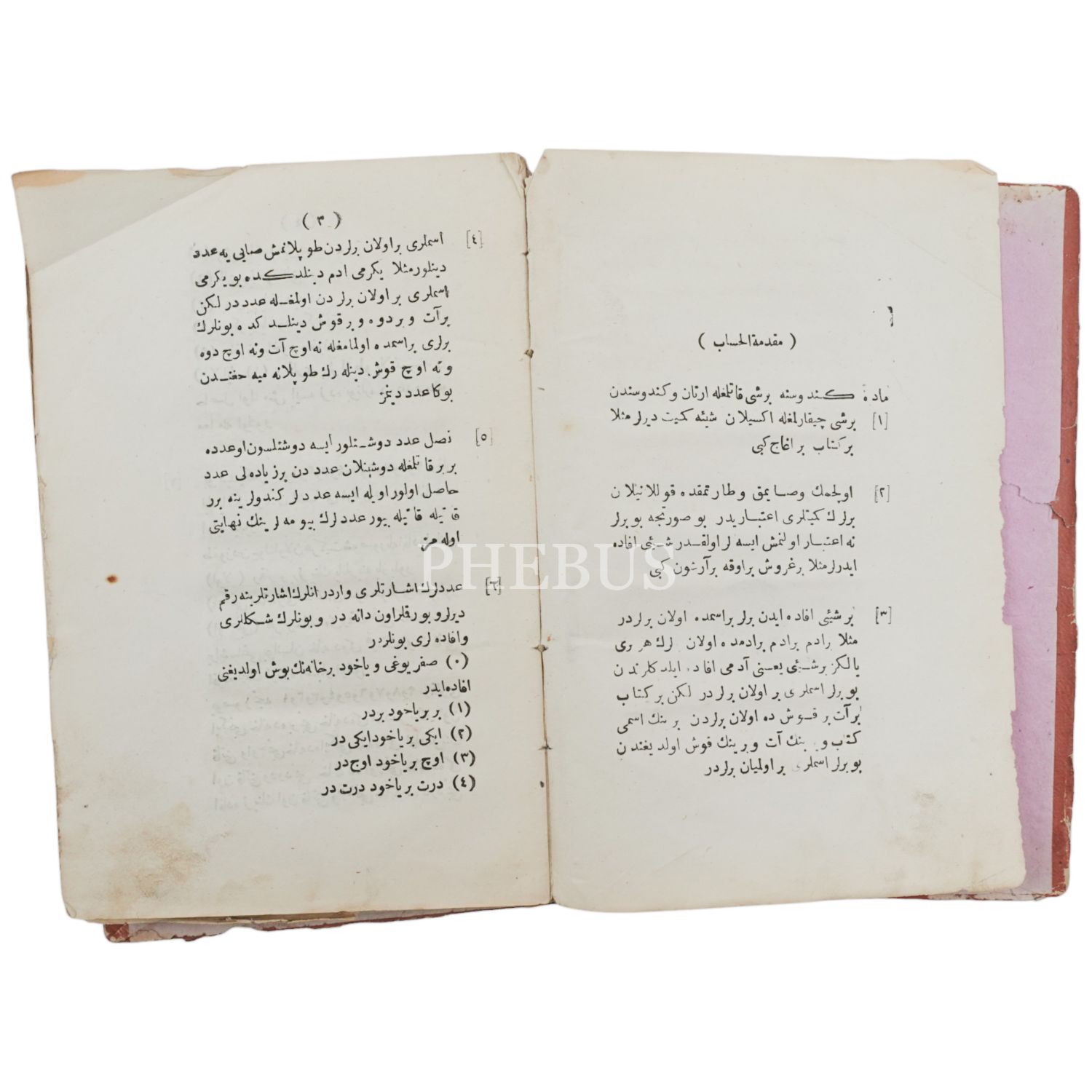 Osmanlı Türkçesinde hazırlanmış matematik eseridir. Okullarda ders kitabı olarak kullanılmak üzere yazılmıştır. * Sırt ve cilt arasında kopmalar vardır.