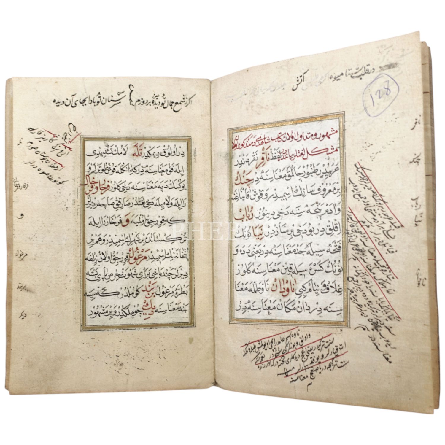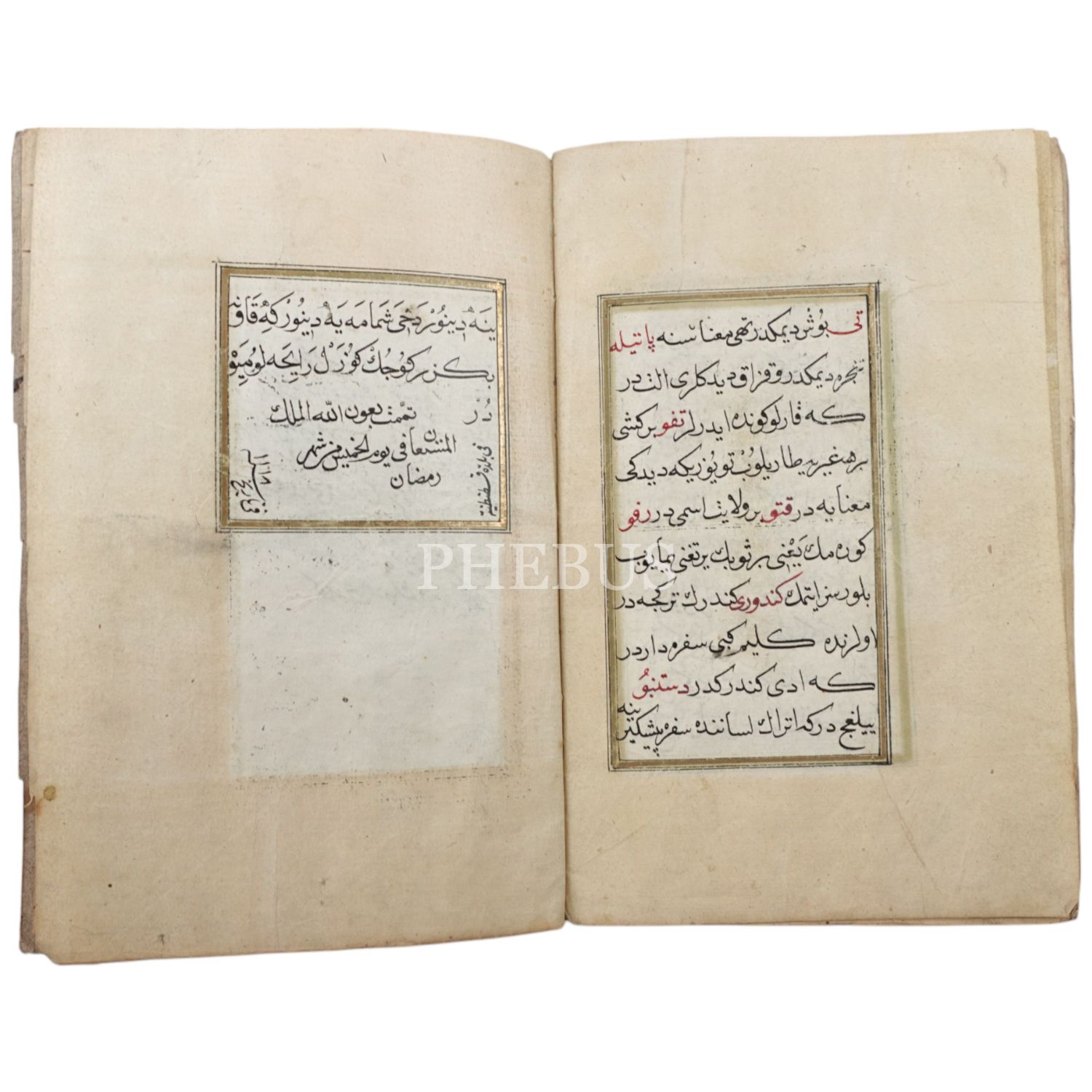 Eski dönem ebru kapağında, tahrirli altın cetvellidir. Madde başlıkları kırmızı mürekkeple yazılmıştır.