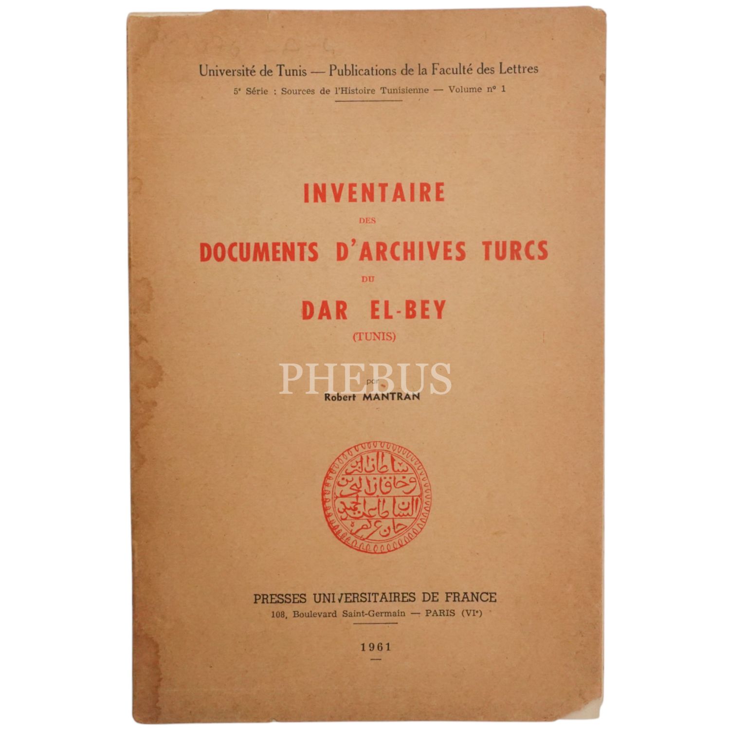 INVENTAIRE DES DOCUMENTS D´ARCHIVES TURCS DU DAR EL-BEY, Robert Mantran, 1961, Paris, 131 sayfa, 16x24cm...